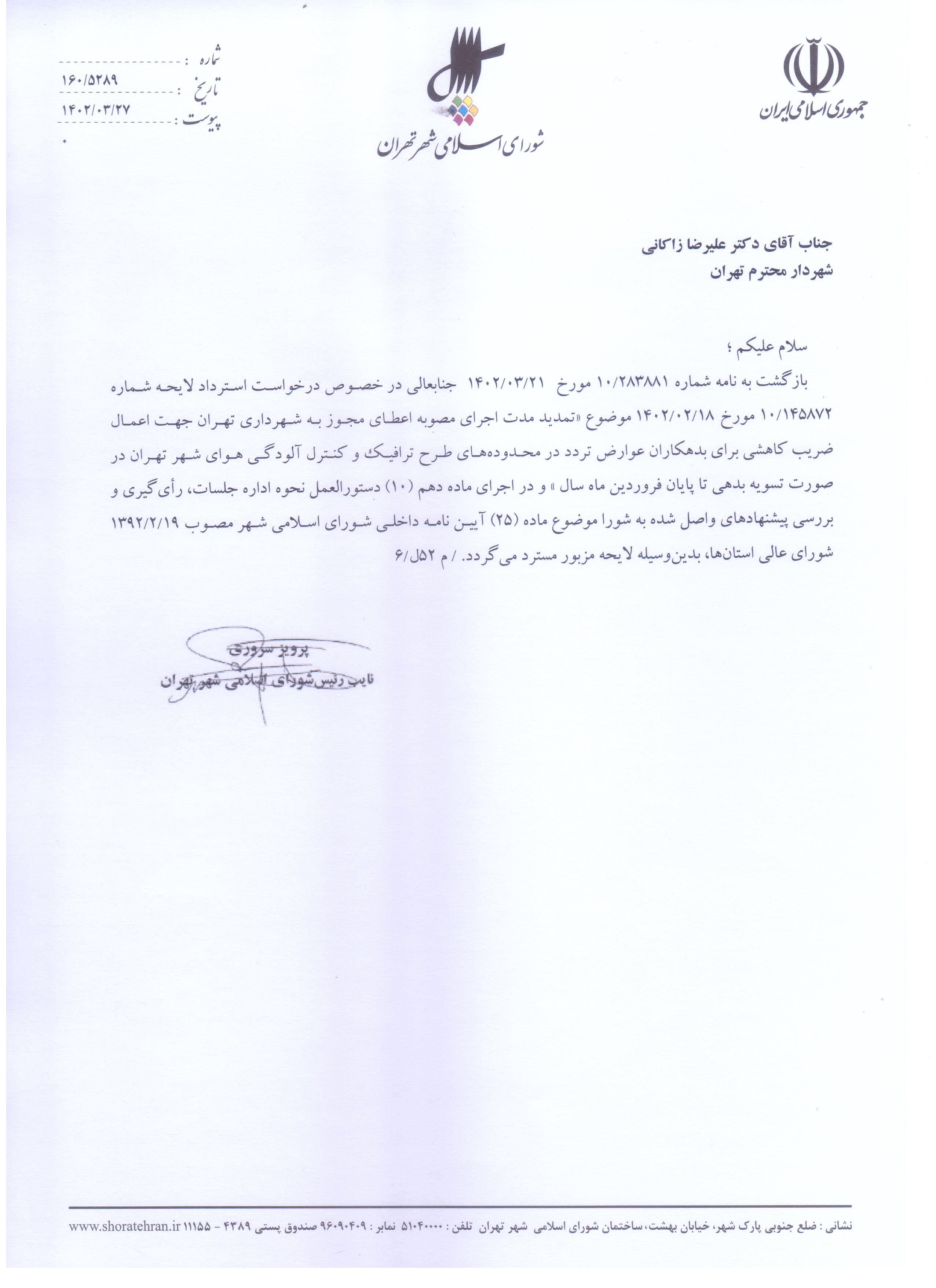 تمديد مدت اجراي مصوبه «اعطاي مجوز به شهرداري تهران جهت اعمال ضريب كاهش براي بدهكاران عوارض تردد در محدوده‌هاي طرح ترافيك و كنترل آلودگي هواي شهر تهران در صورت تسويه بدهي تا پايان فروردين ماه سال 1402»- ابلاغي به شماره 160/3064/2515 مورخ 1401/12/15