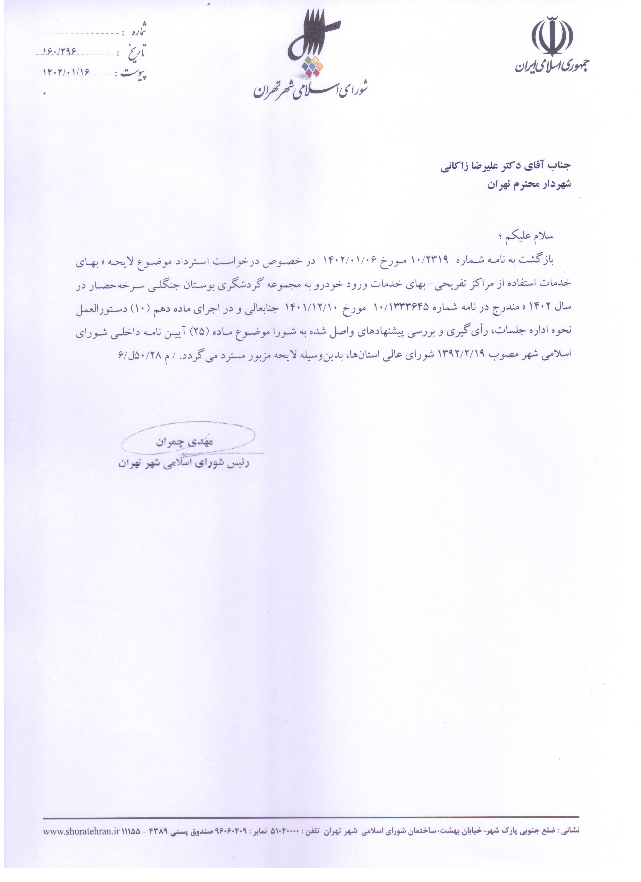 بهاي خدمات استفاده از مراكز تفريحي- بهاي خدمات ورود خودرو به مجموعه گردشگري بوستان جنگلي سرخهحصار در سال 1402