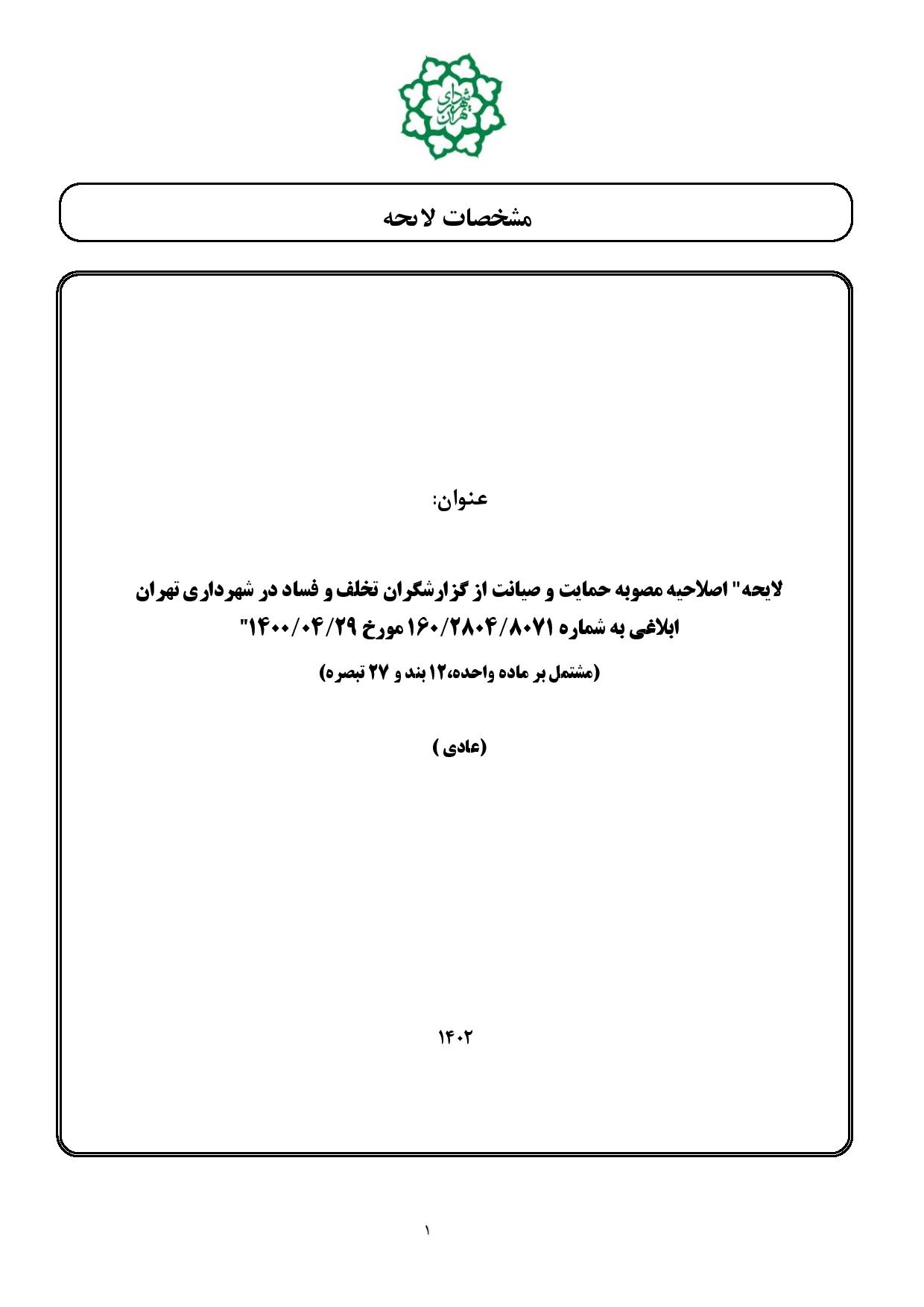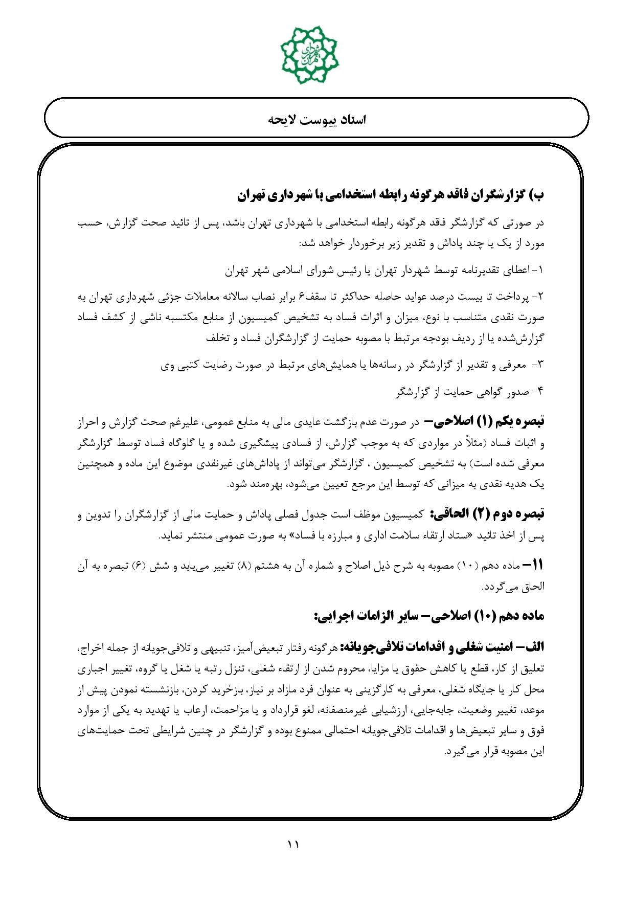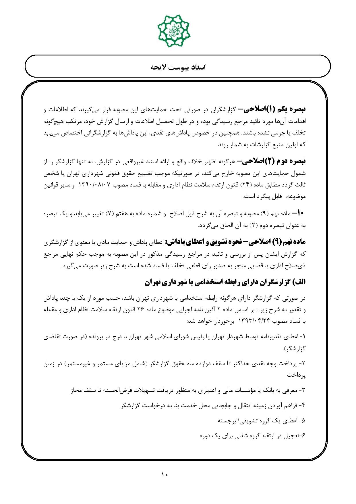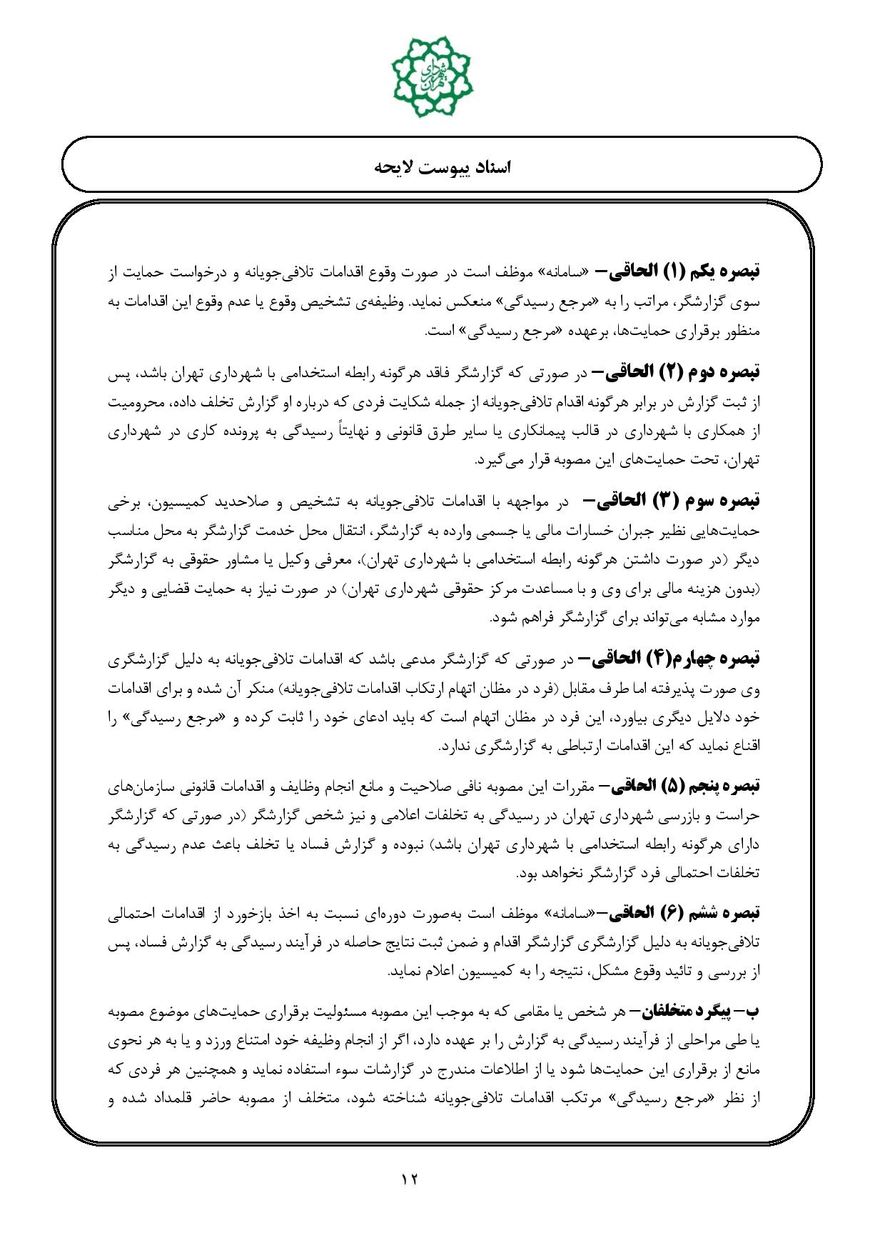 اصلاحيه مصوبه «حمايت و صيانت از گزارشگران تخلف و فساد در شهرداري تهران» - ابلاغي به شماره 160/2804/8071 مورخ 1400/04/29