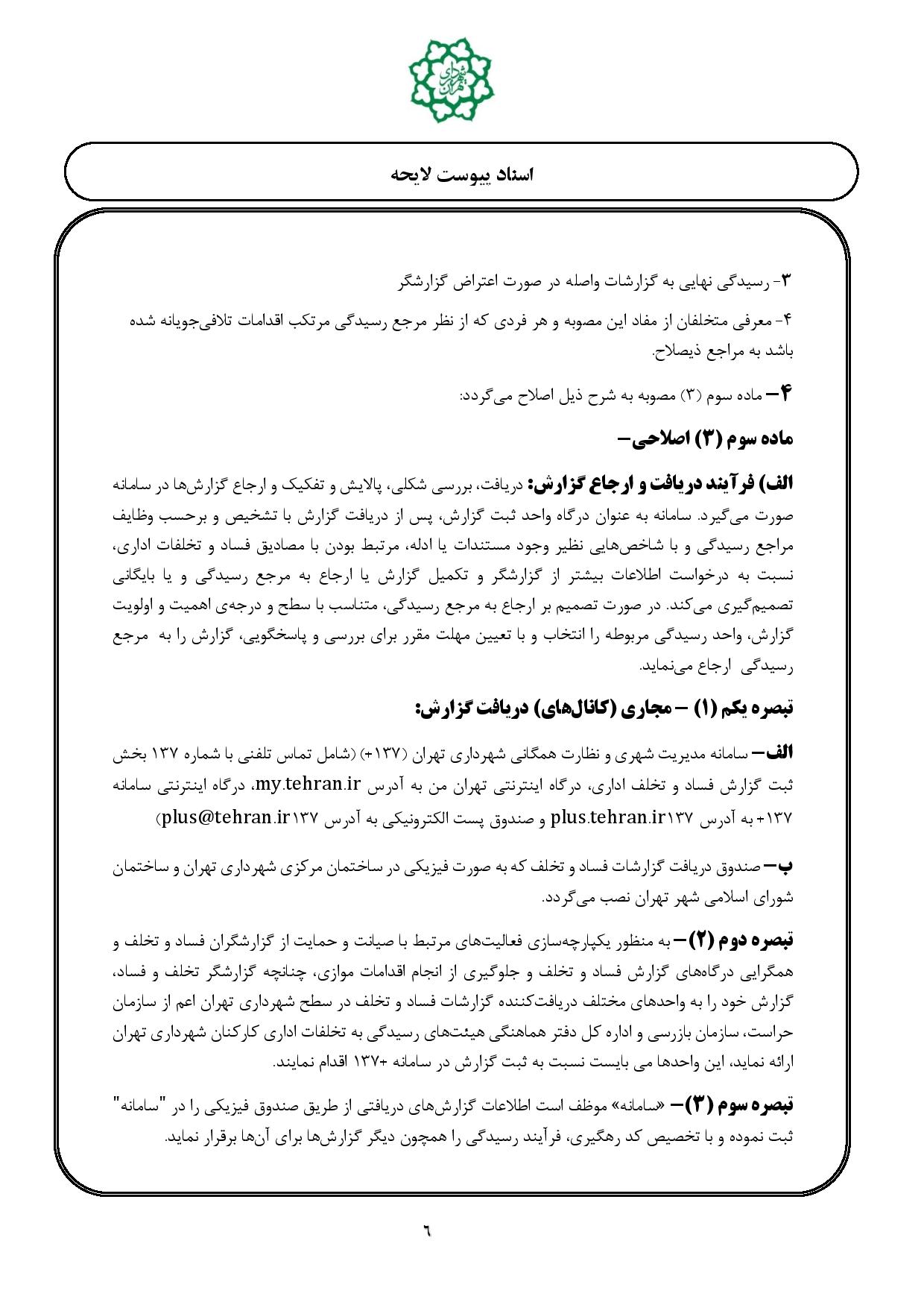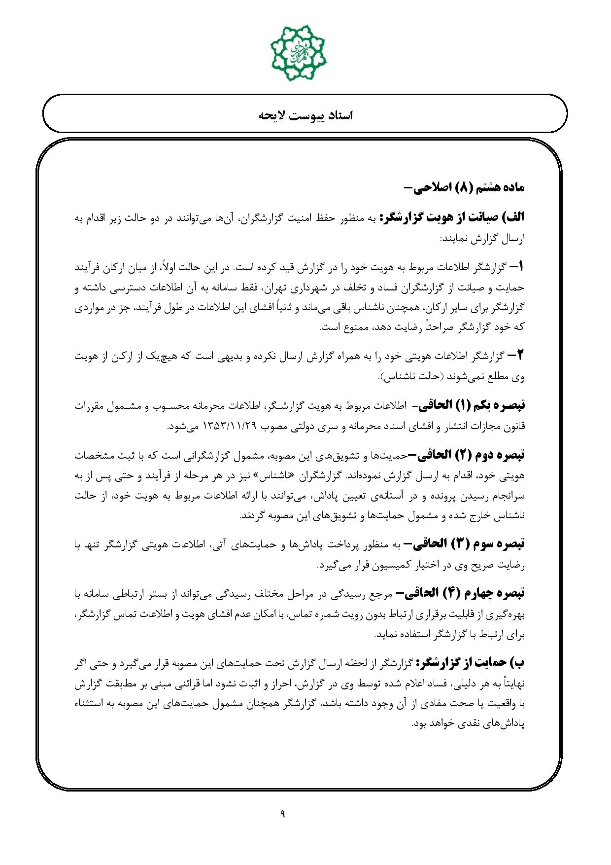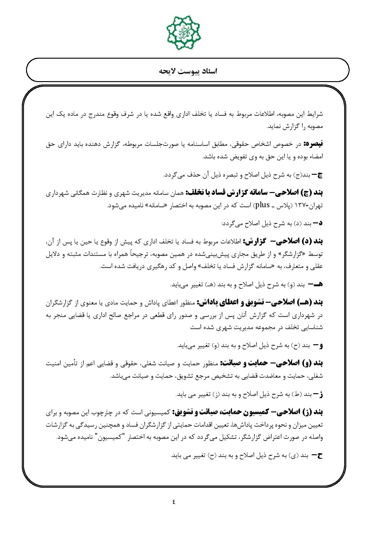 اصلاحيه مصوبه «حمايت و صيانت از گزارشگران تخلف و فساد در شهرداري تهران» - ابلاغي به شماره 160/2804/8071 مورخ 1400/04/29