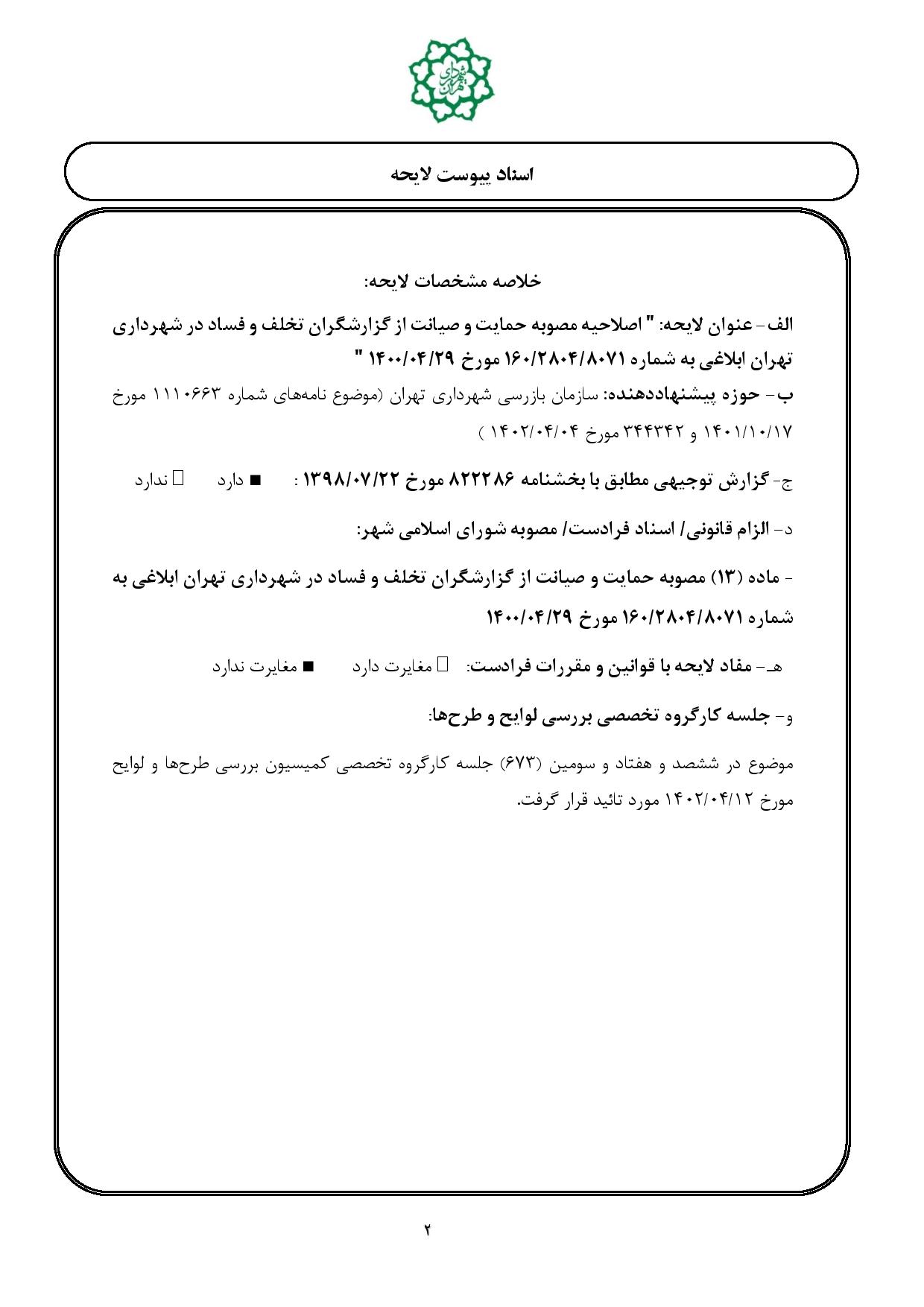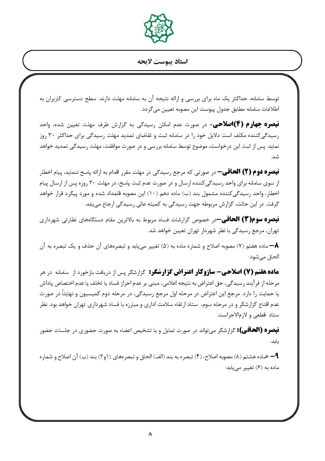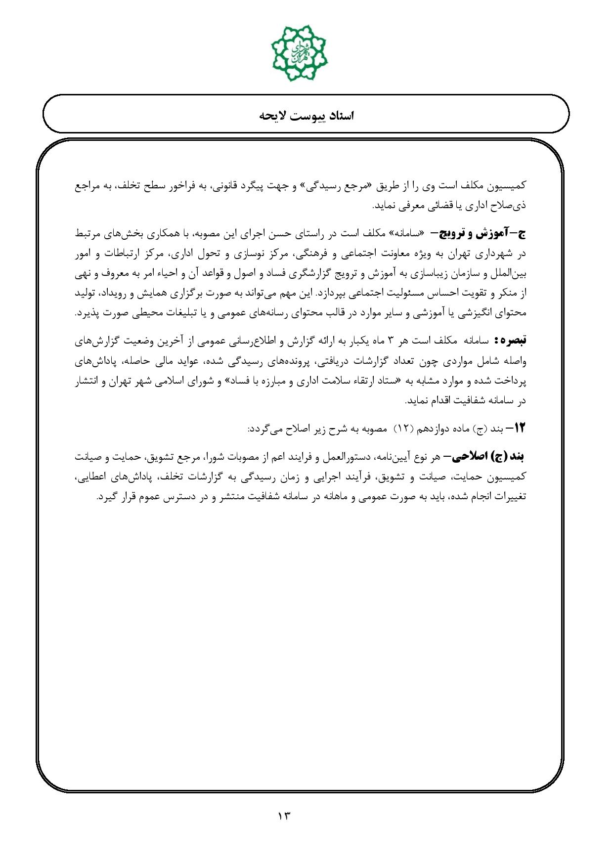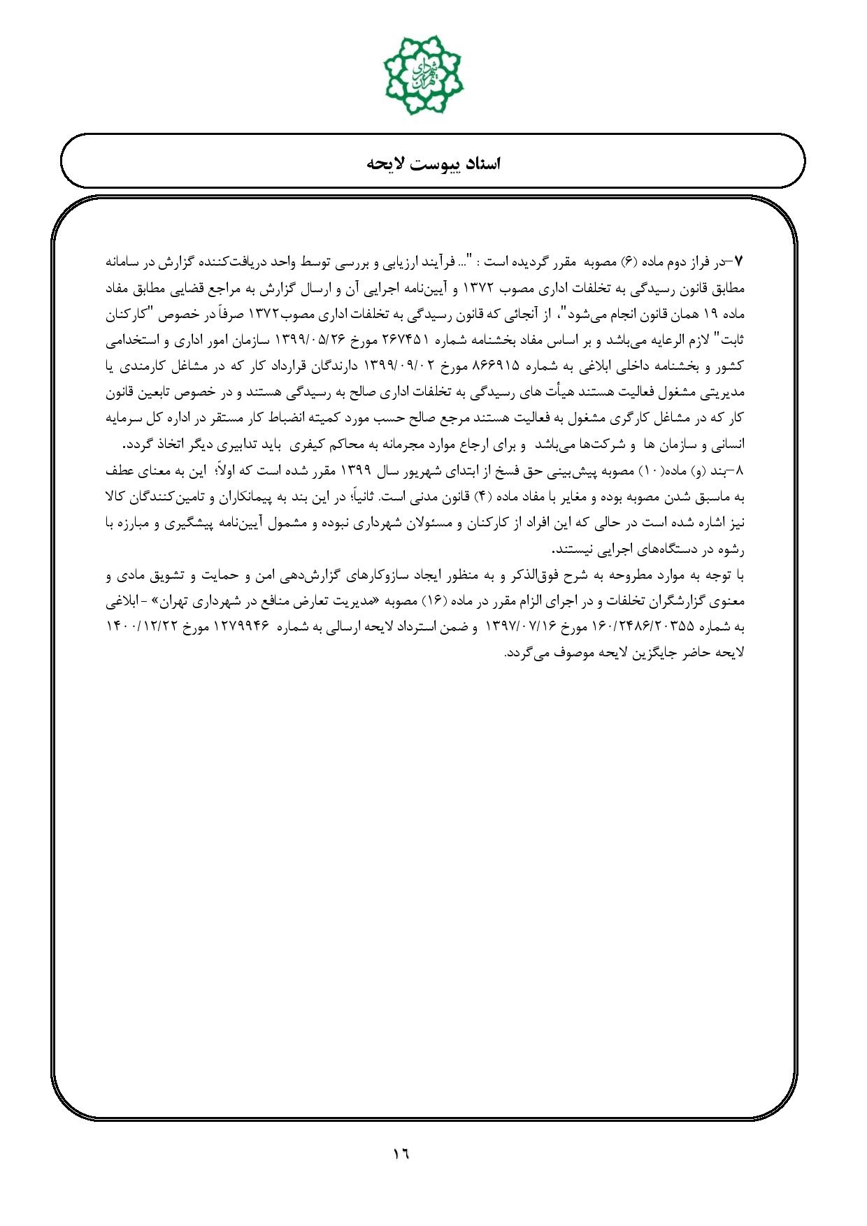 اصلاحيه مصوبه «حمايت و صيانت از گزارشگران تخلف و فساد در شهرداري تهران» - ابلاغي به شماره 160/2804/8071 مورخ 1400/04/29