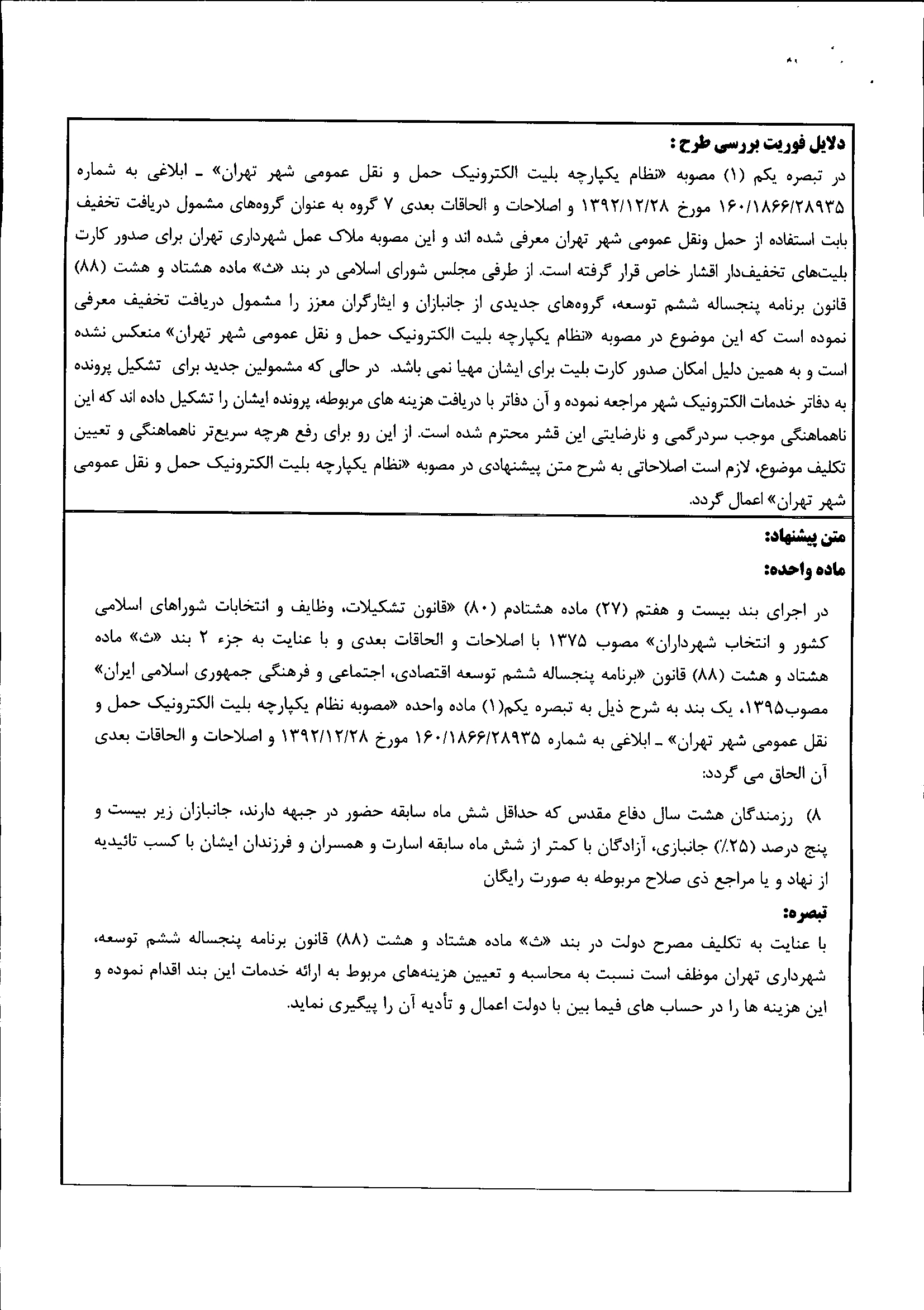 الحاق يك بند به تبصره يكم (1) ماده واحده مصوبه «نظام يكپارچه بليت الكترونيك حمل و نقل عمومي شهر تهران» - ابلاغي به شماره 160/1866/28935 مورخ 1392/12/28 و اصلاحات و الحاقات بعدي