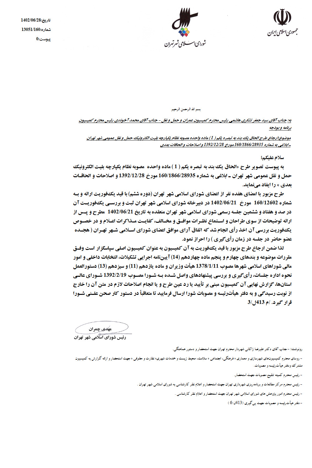 الحاق يك بند به تبصره يكم (1) ماده واحده مصوبه «نظام يكپارچه بليت الكترونيك حمل و نقل عمومي شهر تهران» - ابلاغي به شماره 160/1866/28935 مورخ 1392/12/28 و اصلاحات و الحاقات بعدي