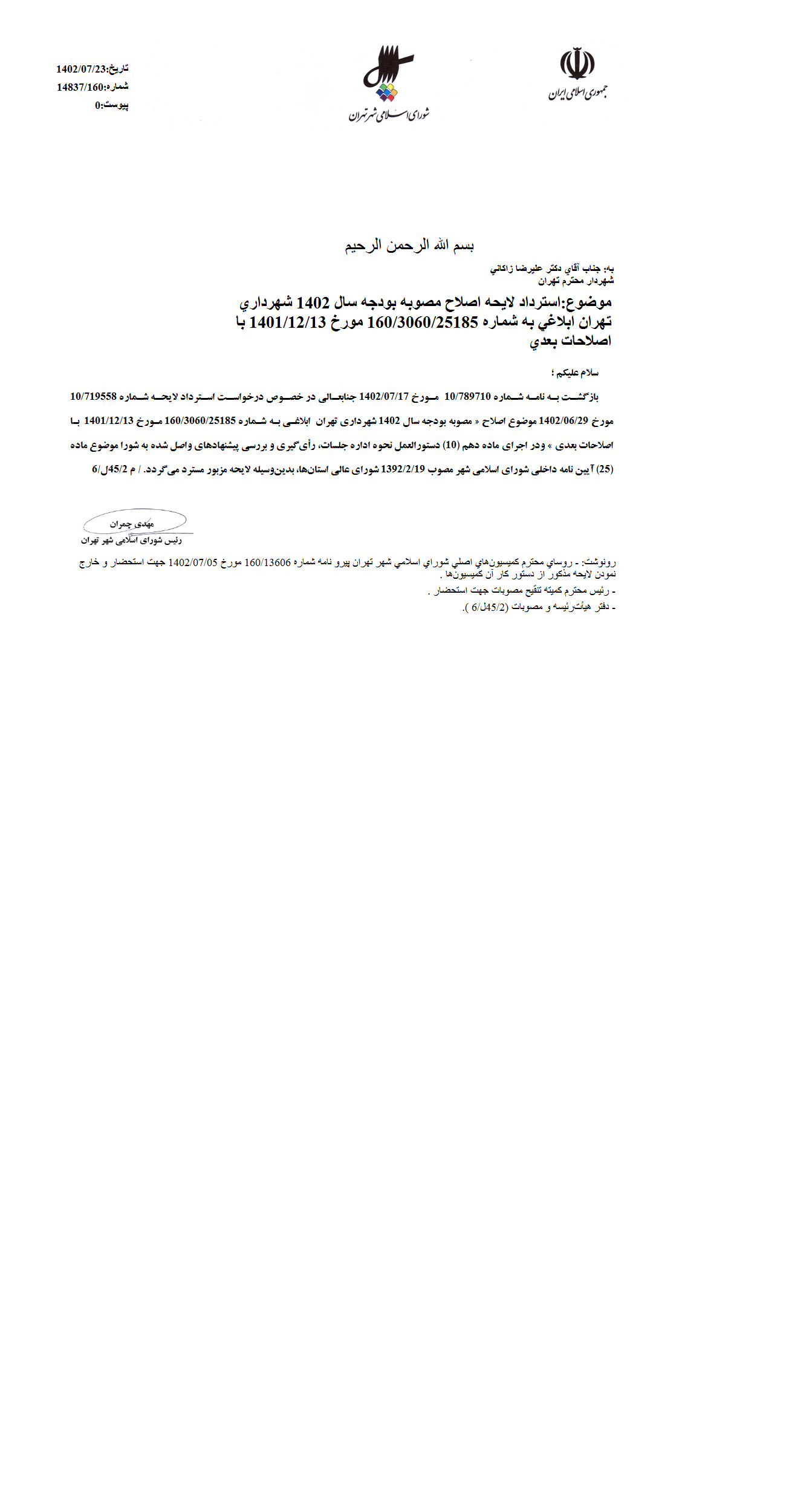 اصلاح مصوبه «بودجه سال 1402 شهرداري تهران» - ابلاغي به شماره 160/3060/25185 مورخ 1401/12/13 با اصلاحات بعدي