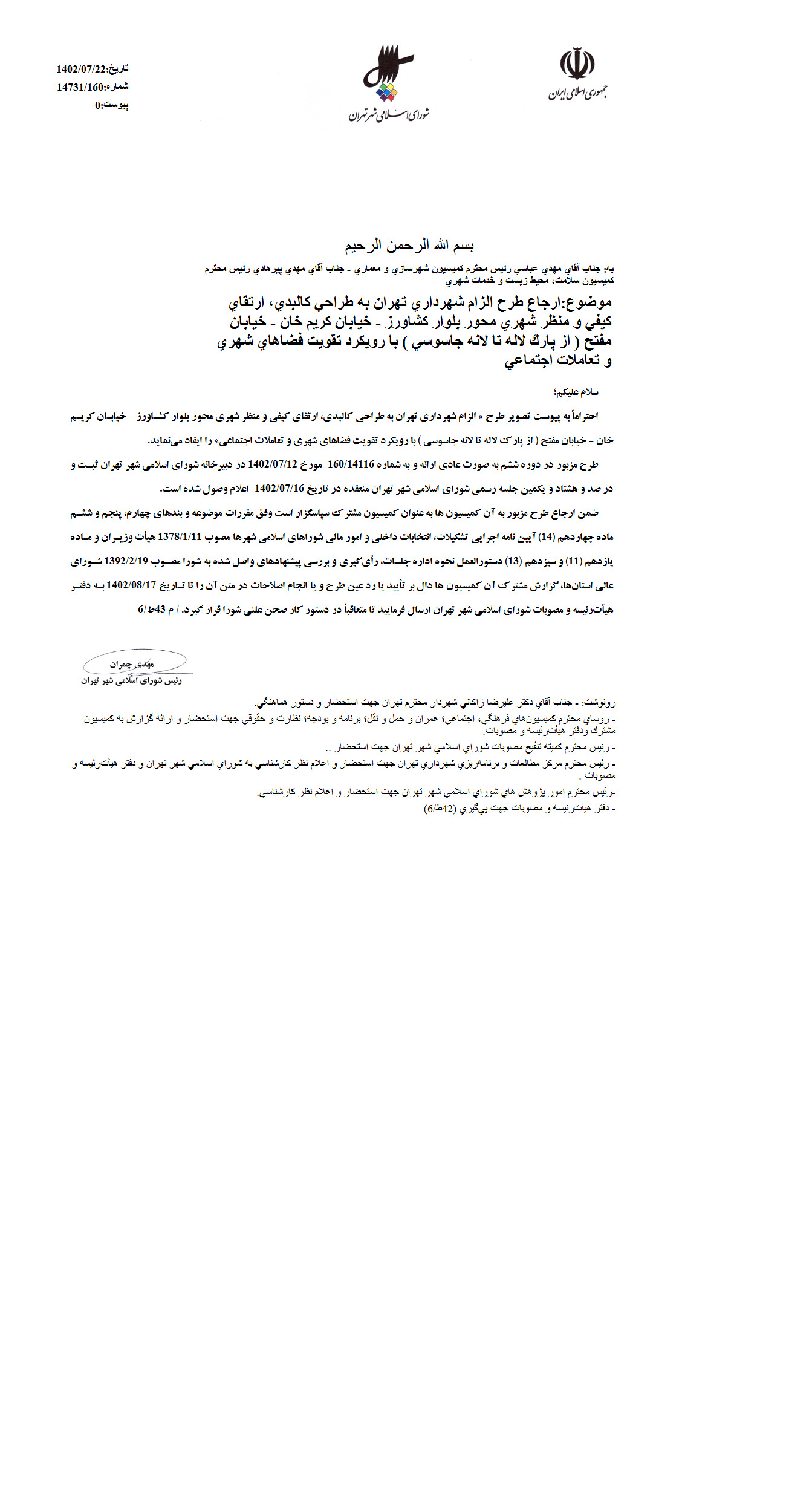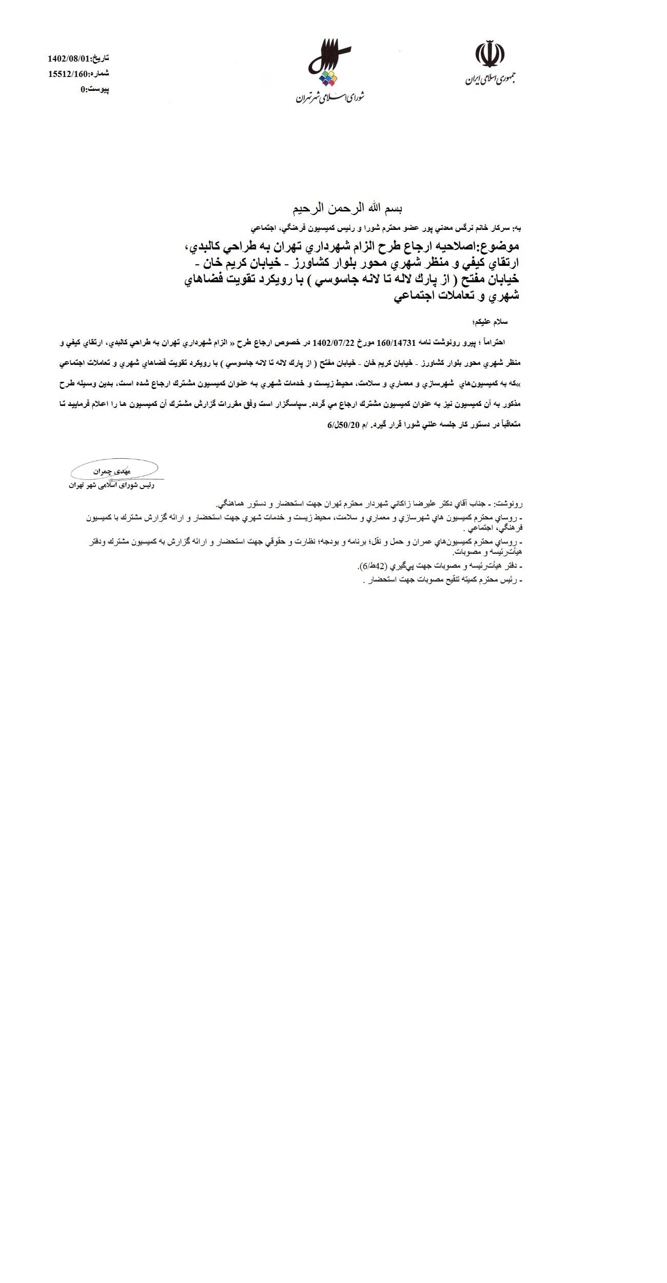 الزام شهرداري تهران به طراحي كالبدي، ارتقاي كيفي و منظر شهري محور بلوار كشاورز - خيابان كريمخان - خيابان مفتح (از پارك لاله تا لانه جاسوسي) با رويكرد تقويت فضاهاي شهري و تعاملات اجتماعي