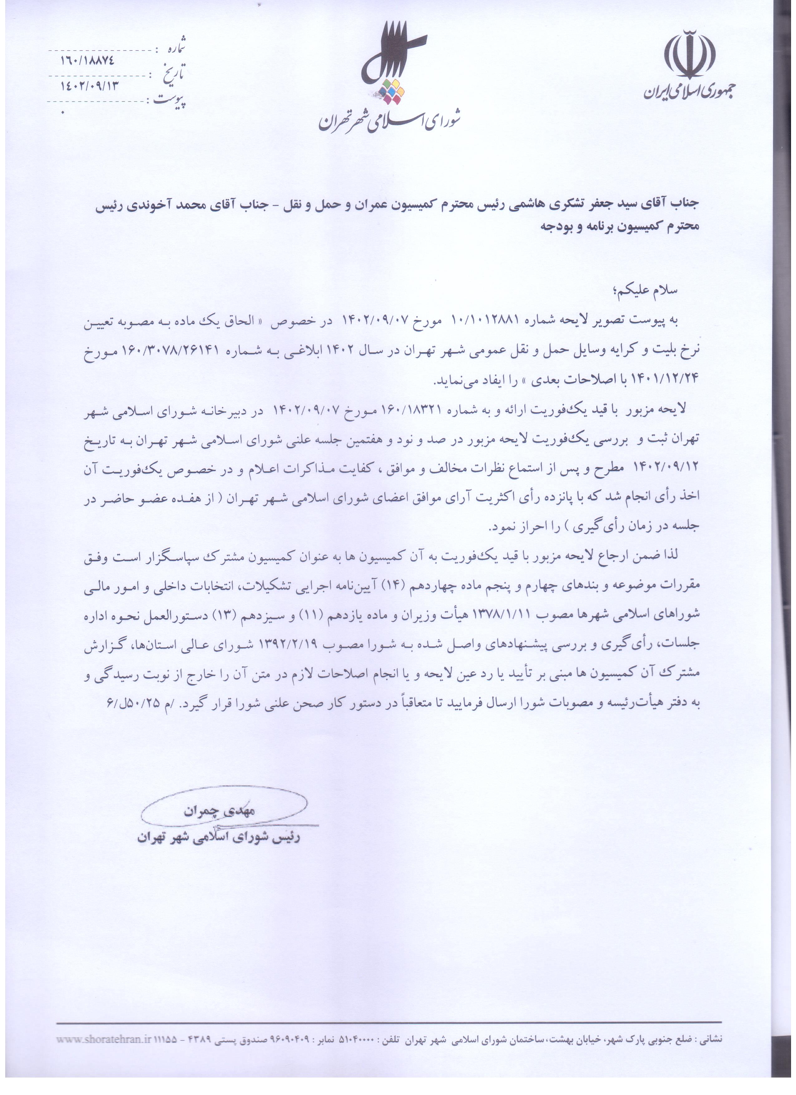 الحاق يك ماده به مصوبه «تعيين نرخ بليت و كرايه وسايل حمل و نقل عمومي شهر تهران در سال 1402» - ابلاغي به شماره 160/3078/26141 ورخ 1401/12/24 با اصلاحات بعدي