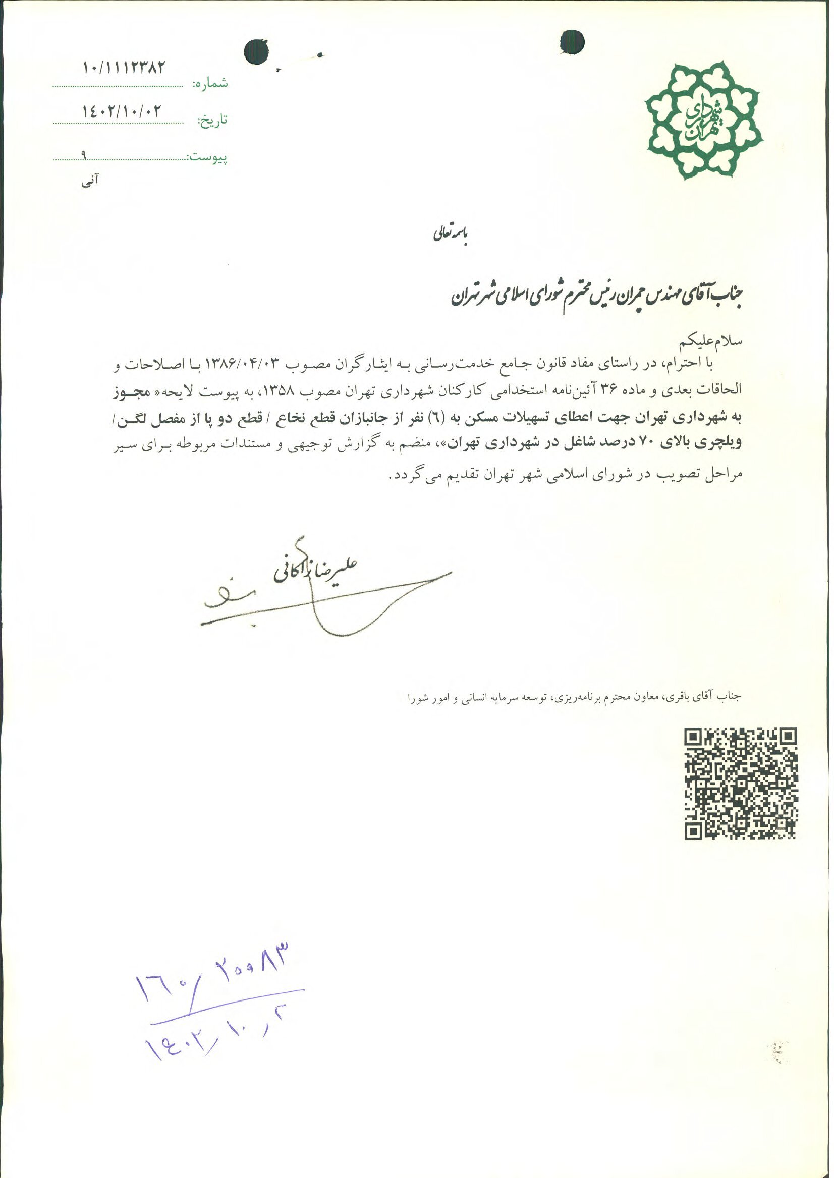 مجوز به شهرداري تهران جهت اعطاي تسهيلات مسكن به (6) نفر از جانبازان قطع نخاع/ قطع دو پا از مفصل لگن/ ويلچري بالاي 70 درصد شاغل در شهرداري تهران