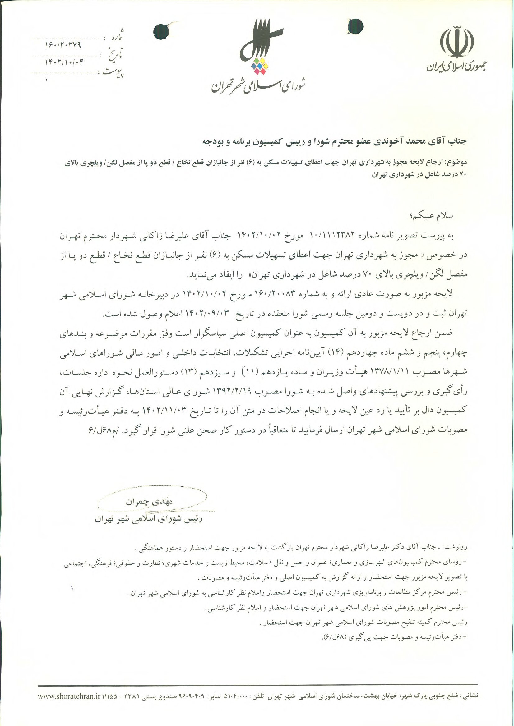 مجوز به شهرداري تهران جهت اعطاي تسهيلات مسكن به (6) نفر از جانبازان قطع نخاع/ قطع دو پا از مفصل لگن/ ويلچري بالاي 70 درصد شاغل در شهرداري تهران