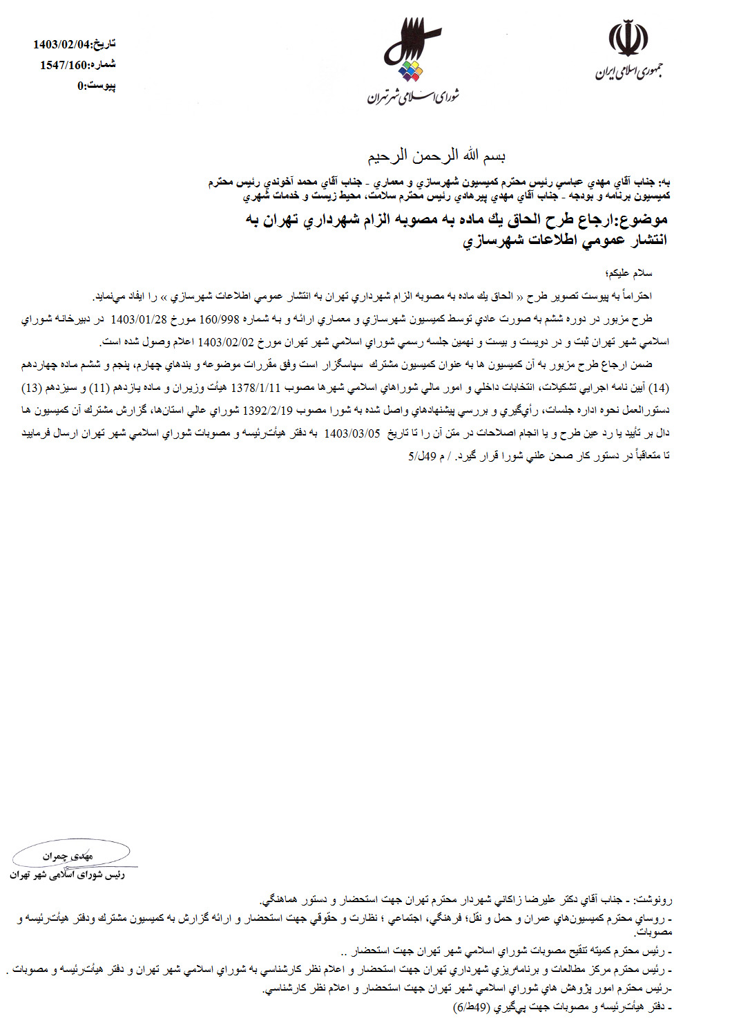 الحاق يك ماده به مصوبه «الزام شهرداري تهران به انتشار عمومي اطلاعات شهرسازي»