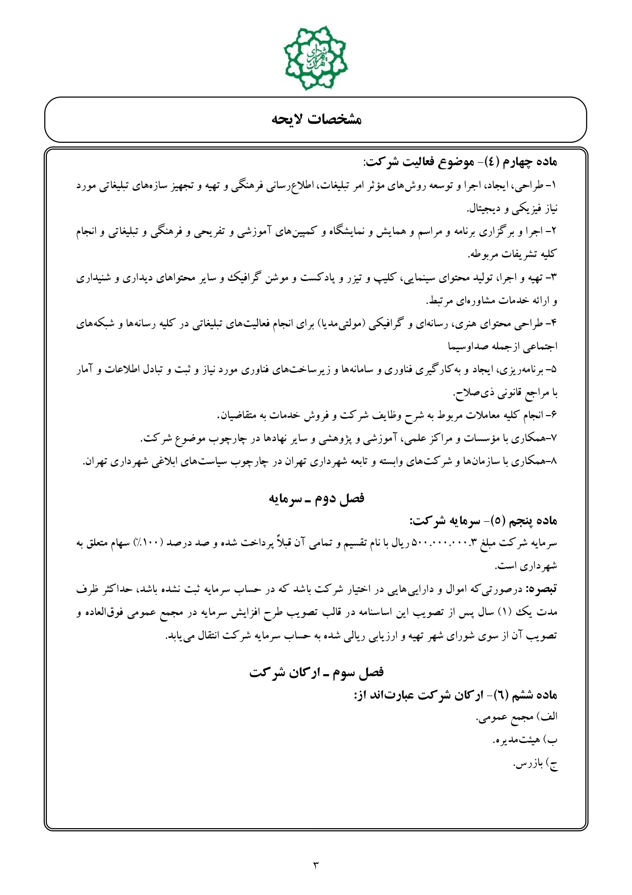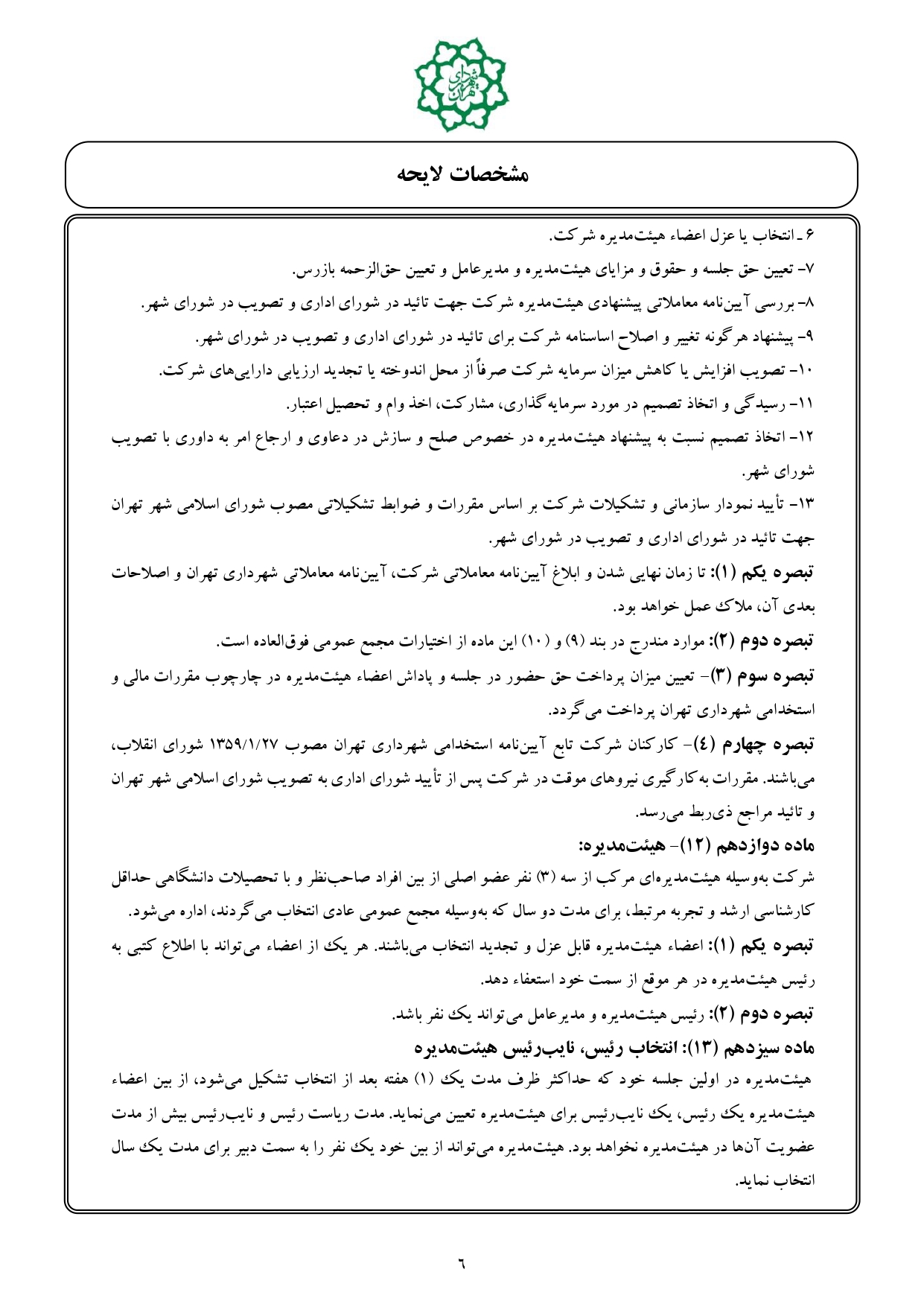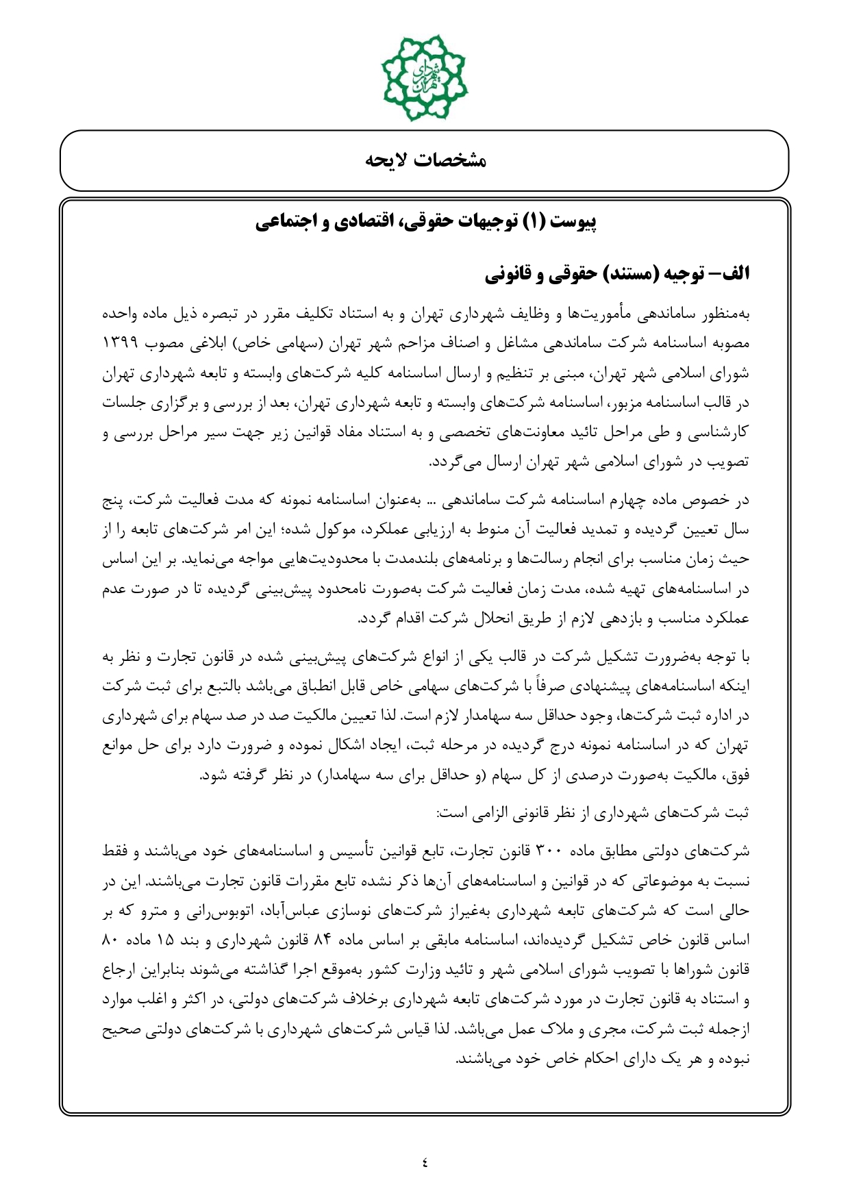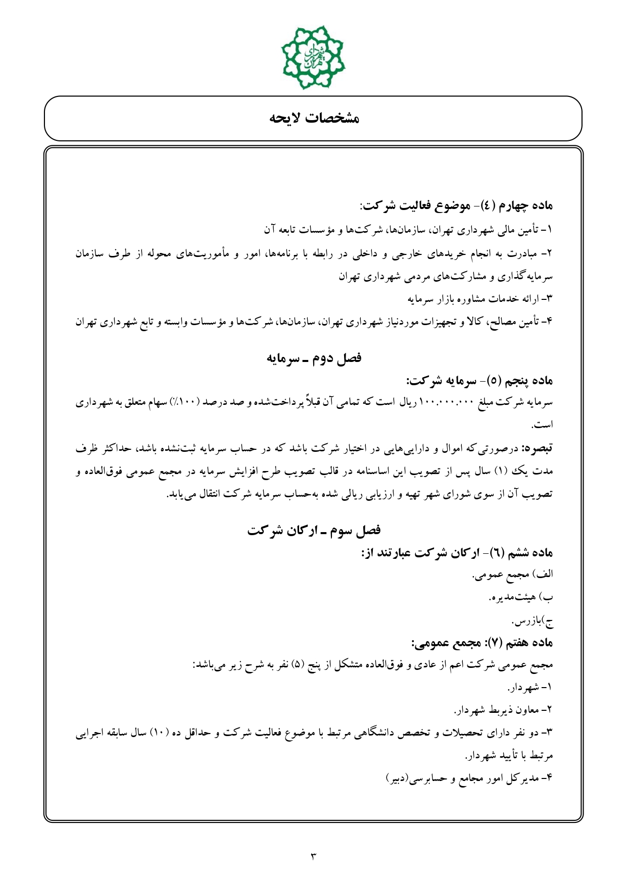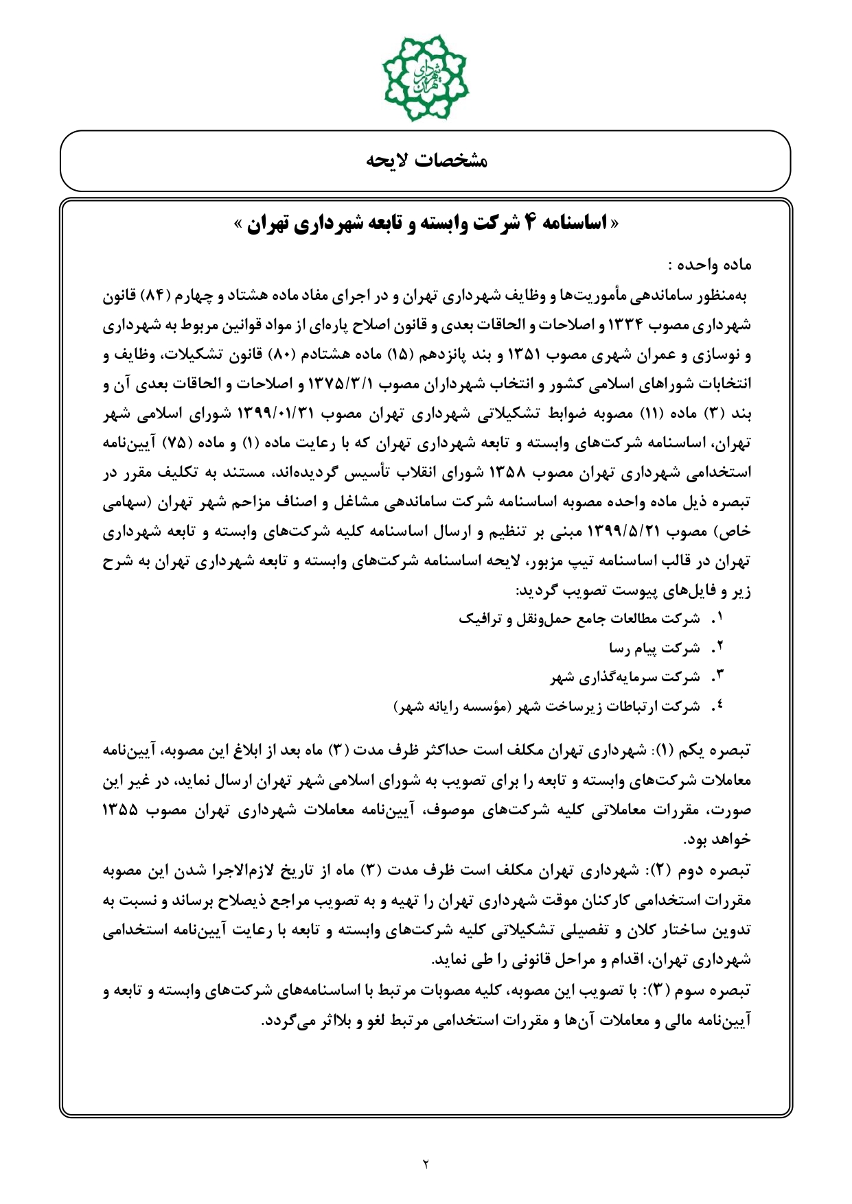 اساسنامه 4 شركت وابسته و تابعه شهرداري تهران