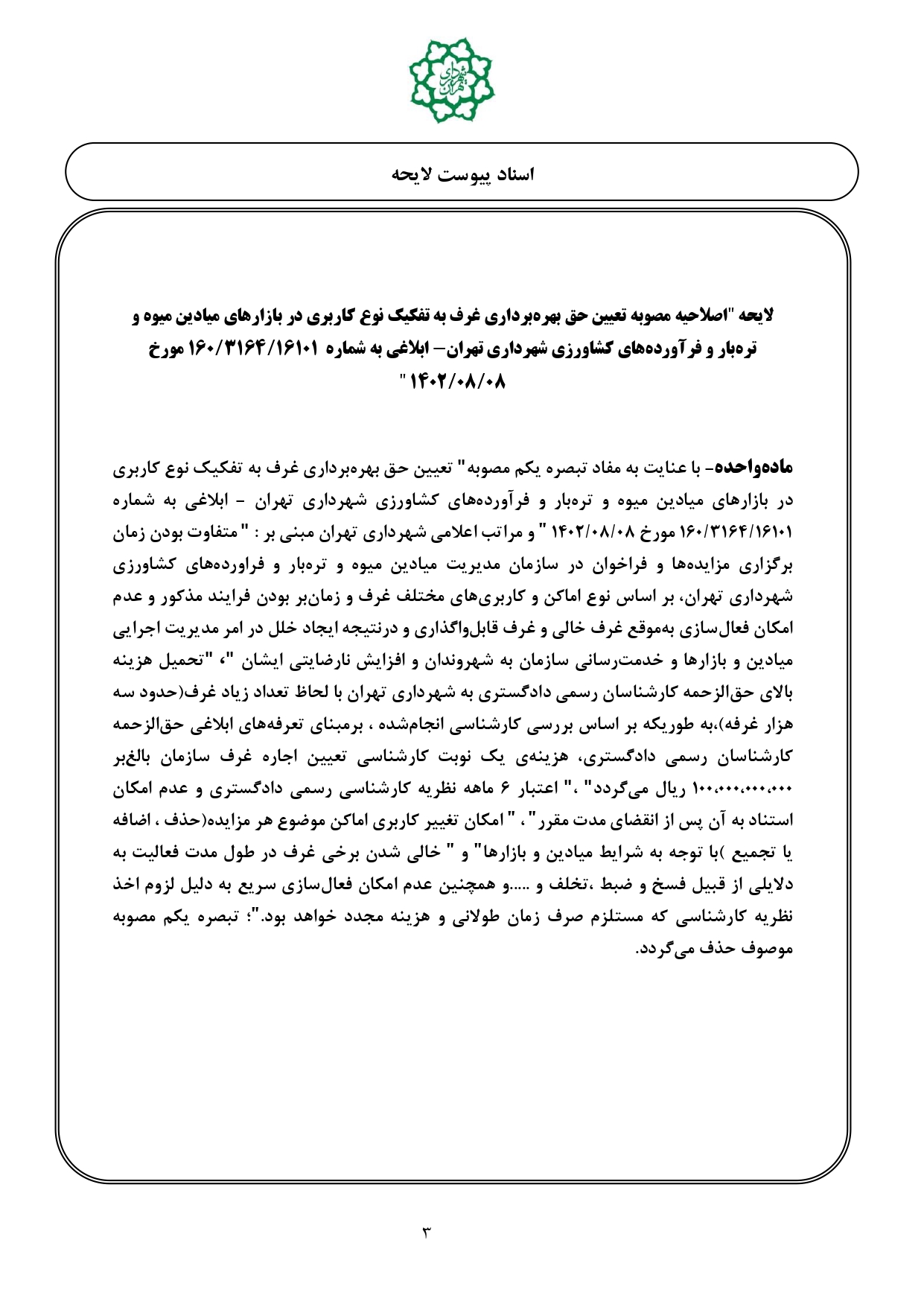 اصلاحيه مصوبه «تعيين حق بهرهبرداري غرف به تفكيك نوع كاربري در بازارهاي ميادين ميوه و ترهبار و فرآوردههاي كشاورزي شهرداري تهران» - ابلاغي به شماره 160/3164/16101 مورخ 1402/08/08