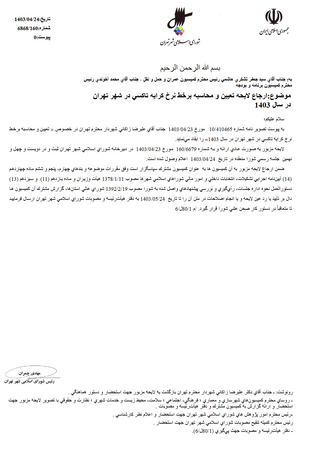 تعيين و محاسبه بر خط نرخ كرايه تاكسي در شهر تهران در سال 1403