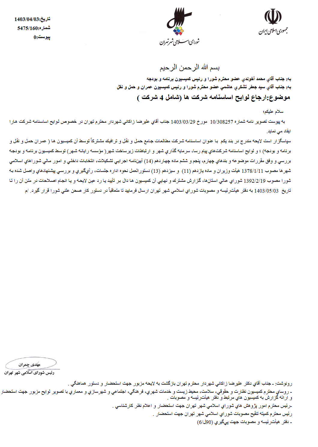 اساسنامه شركت زيرساخت ارتباطي شهر (مؤسسه رايانه شهر)