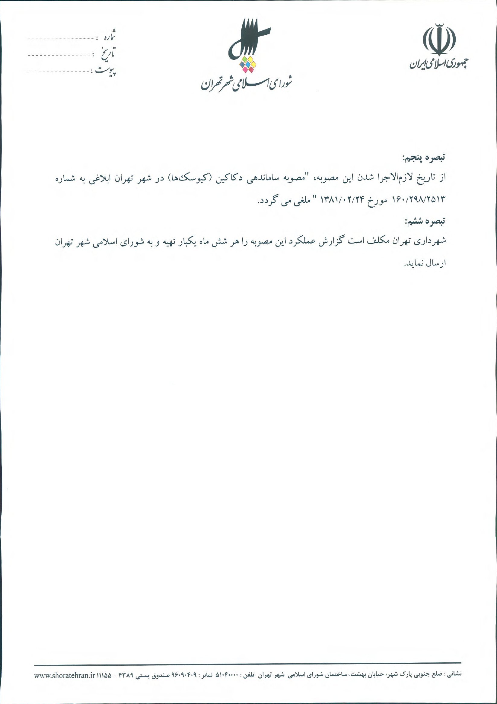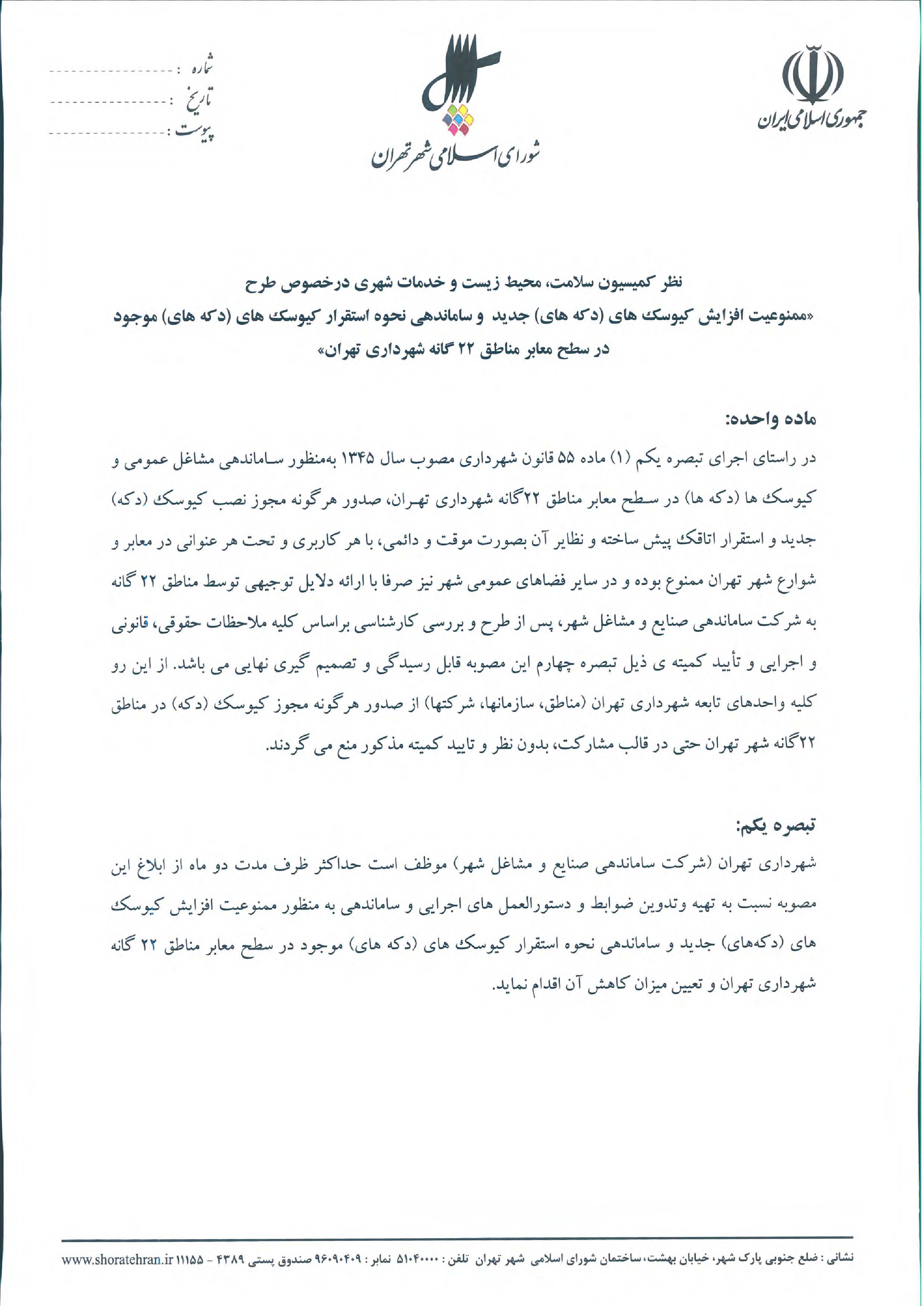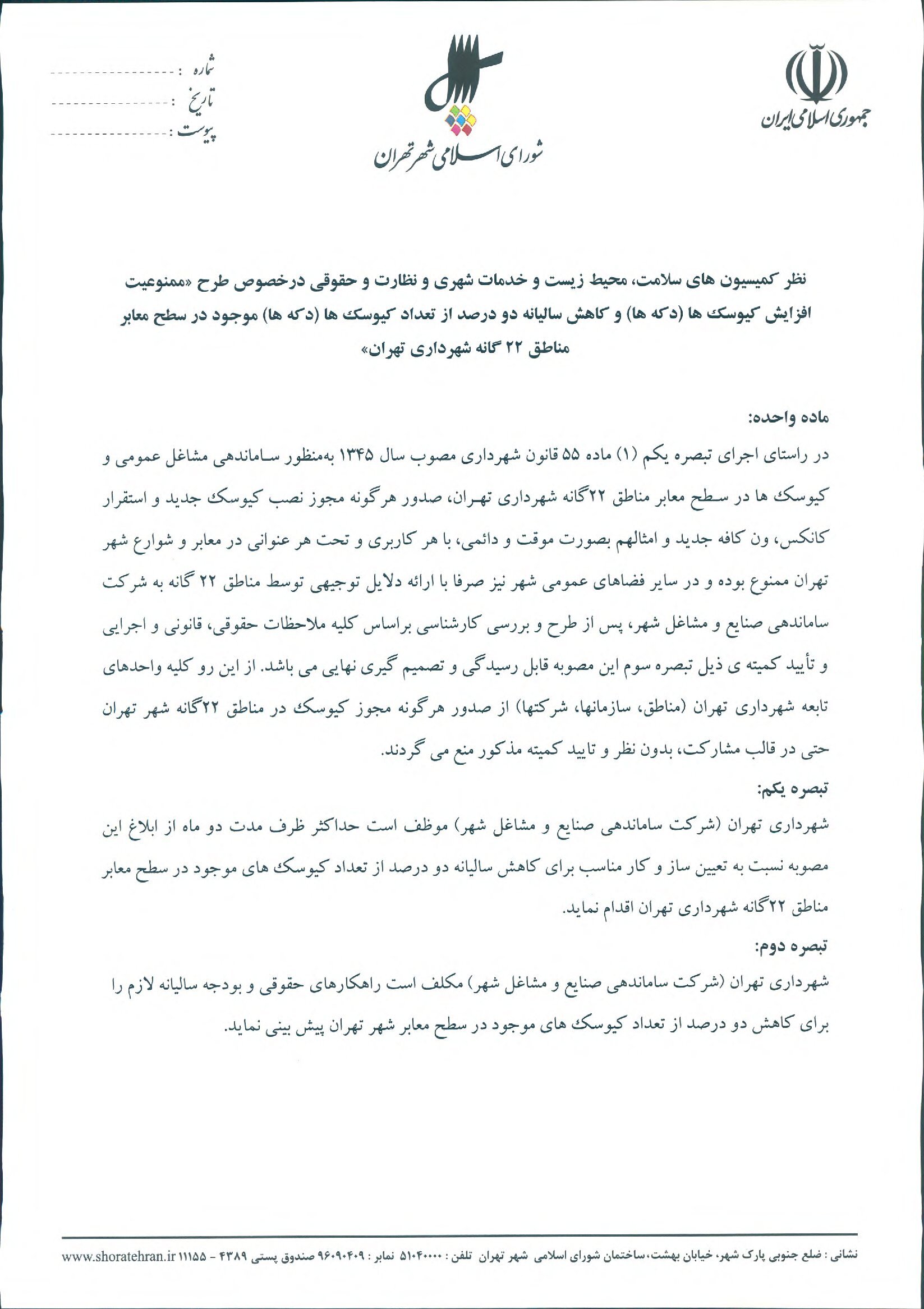 ممنوعيت افزايش كيوسكها (دكهها) و كاهش ساليانه دو درصد از تعداد كيوسكها (دكهها) موجود در سطح مناطق 22گانه شهرداري تهران