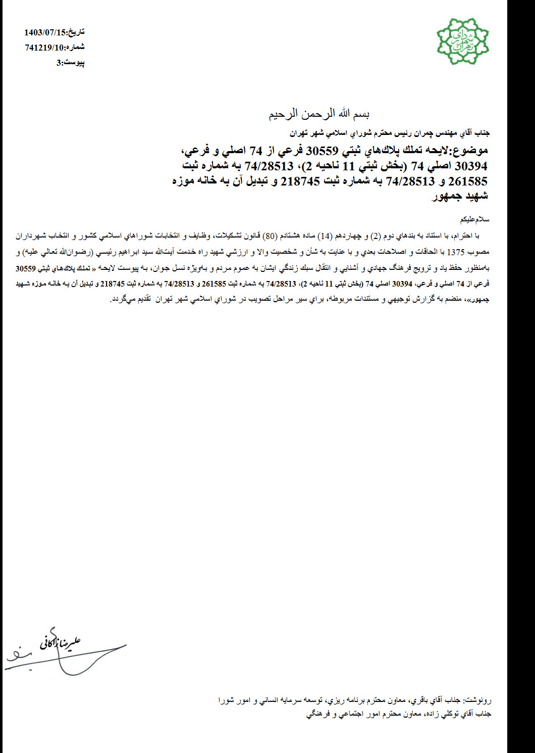 تملك پلاكهاي ثبتي 30559 از 74 اصلي و فرعي، 30394 اصلي از 74 (بخش ثبتي 11 ناحيه 2)، 74/28513 به شماره ثبت 218745 و تبديل آن به خانه موزه شهيد جمهور