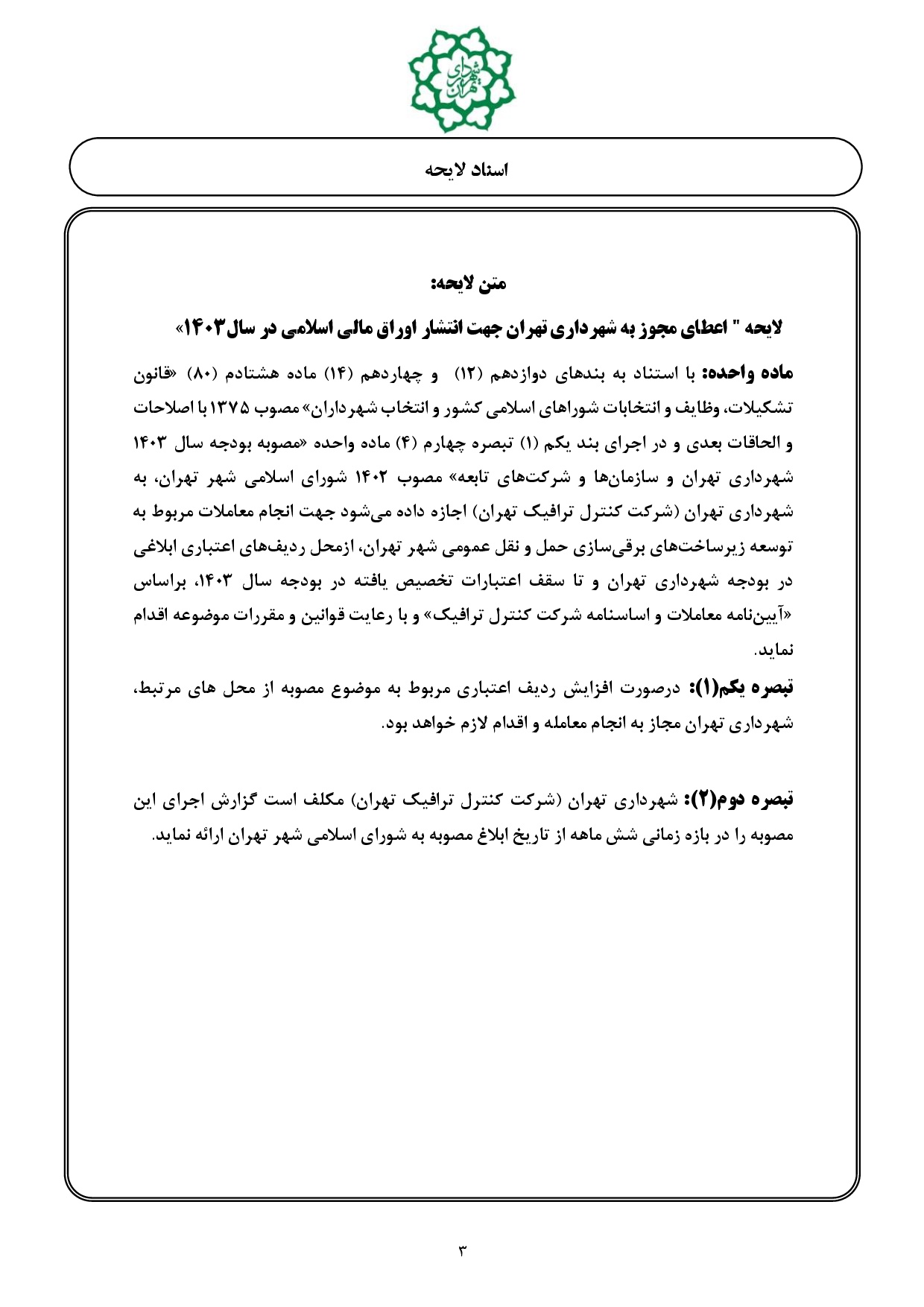 اعطاي مجوز به شهرداري تهران جهت انجام معاملات مربوط به توسعه زيرساختهاي برقيسازي حمل و نقل عمومي شهر تهران