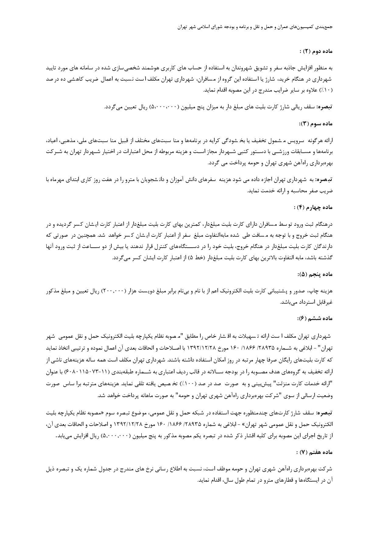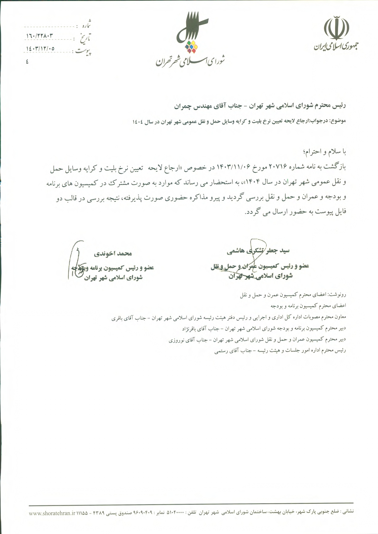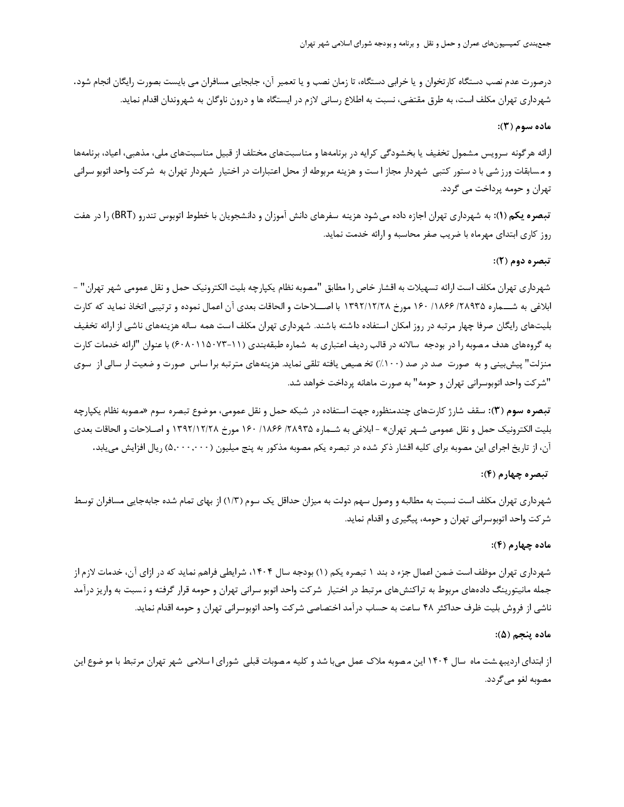 تعيين نرخ بليت و كرايه وسايل حمل و نقل عمومي شهر تهران در سال 1404