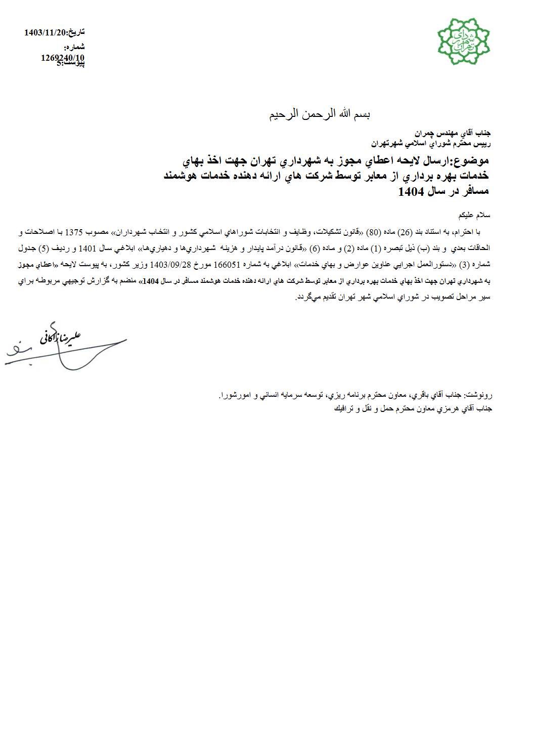 اعطاي مجوز به شهرداري تهران جهت اخذ بهاي خدمات بهرهبرداري از معابر توسط شركتهاي ارائهدهنده خدمات هوشمند مسافر در سال 1404