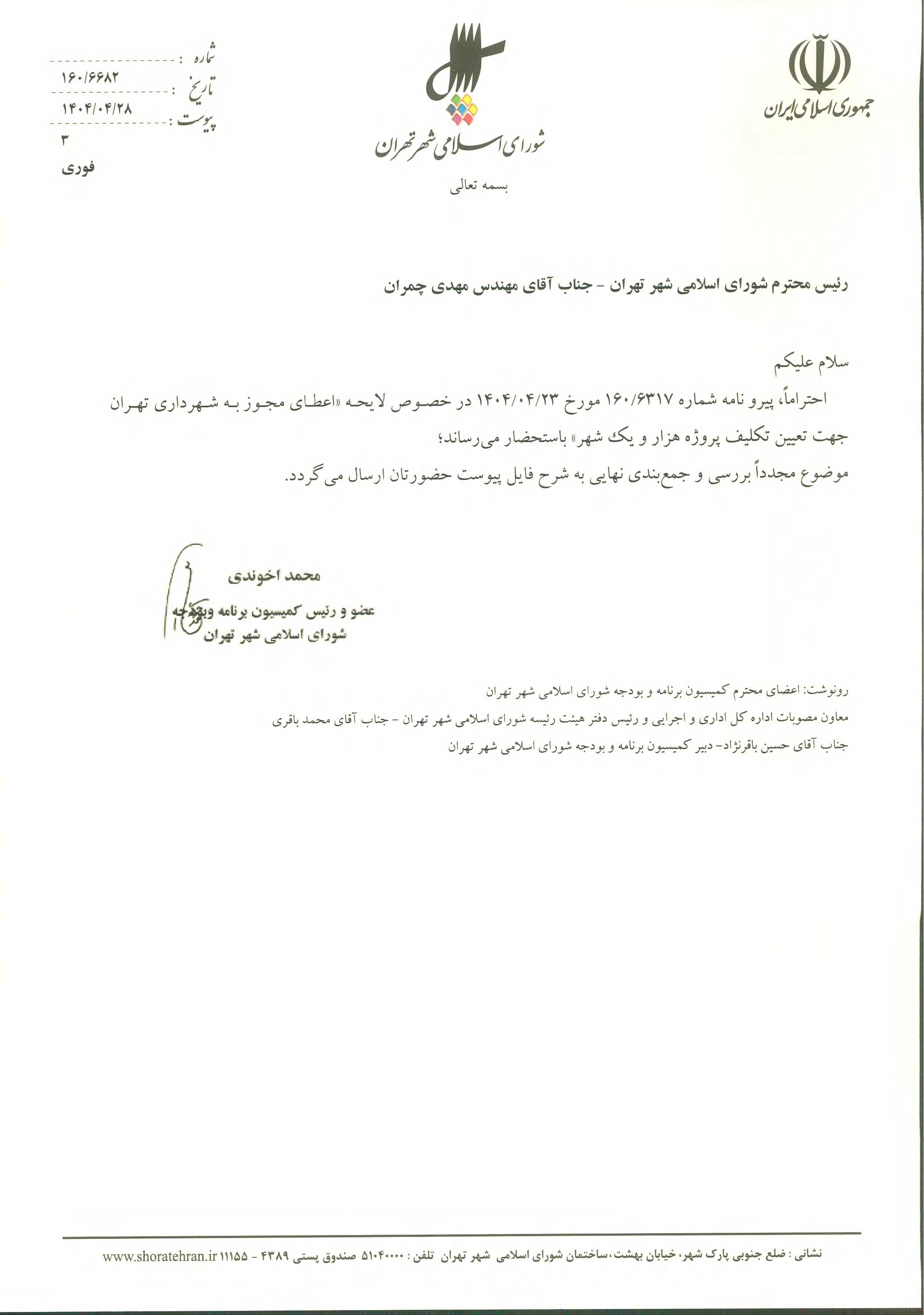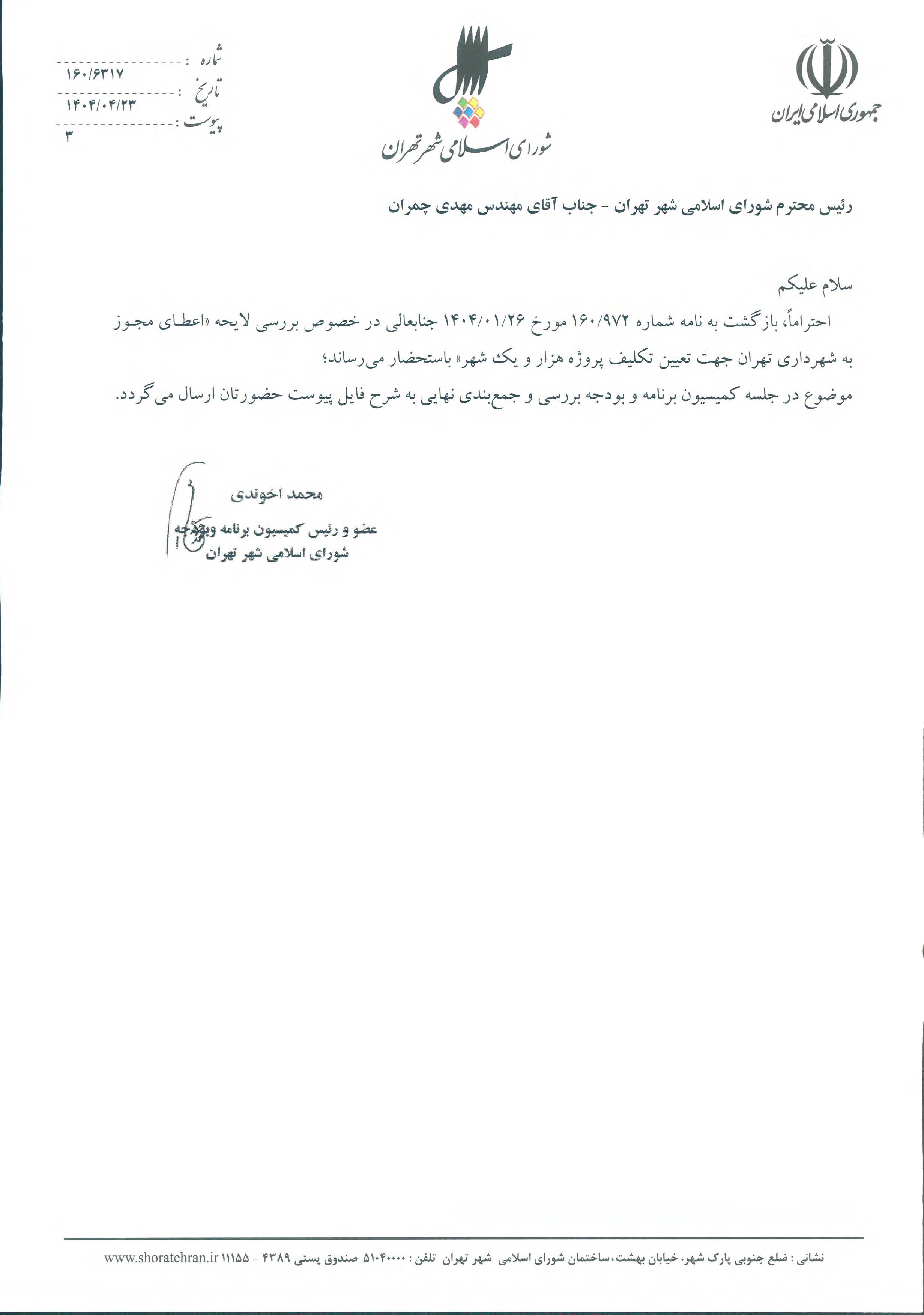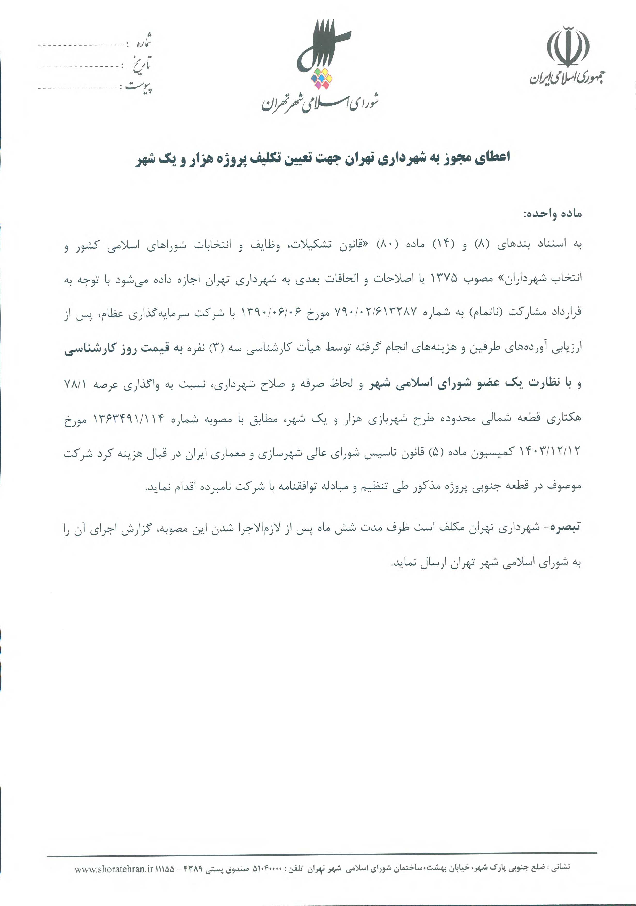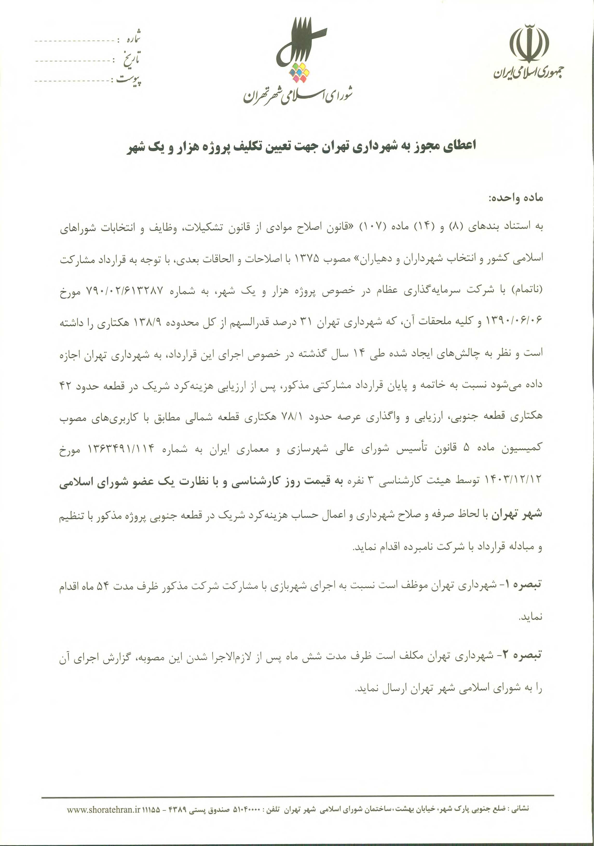 اعطاي مجوز به شهرداري تهران جهت تعيين تكليف پروژه هزار و يك شهر