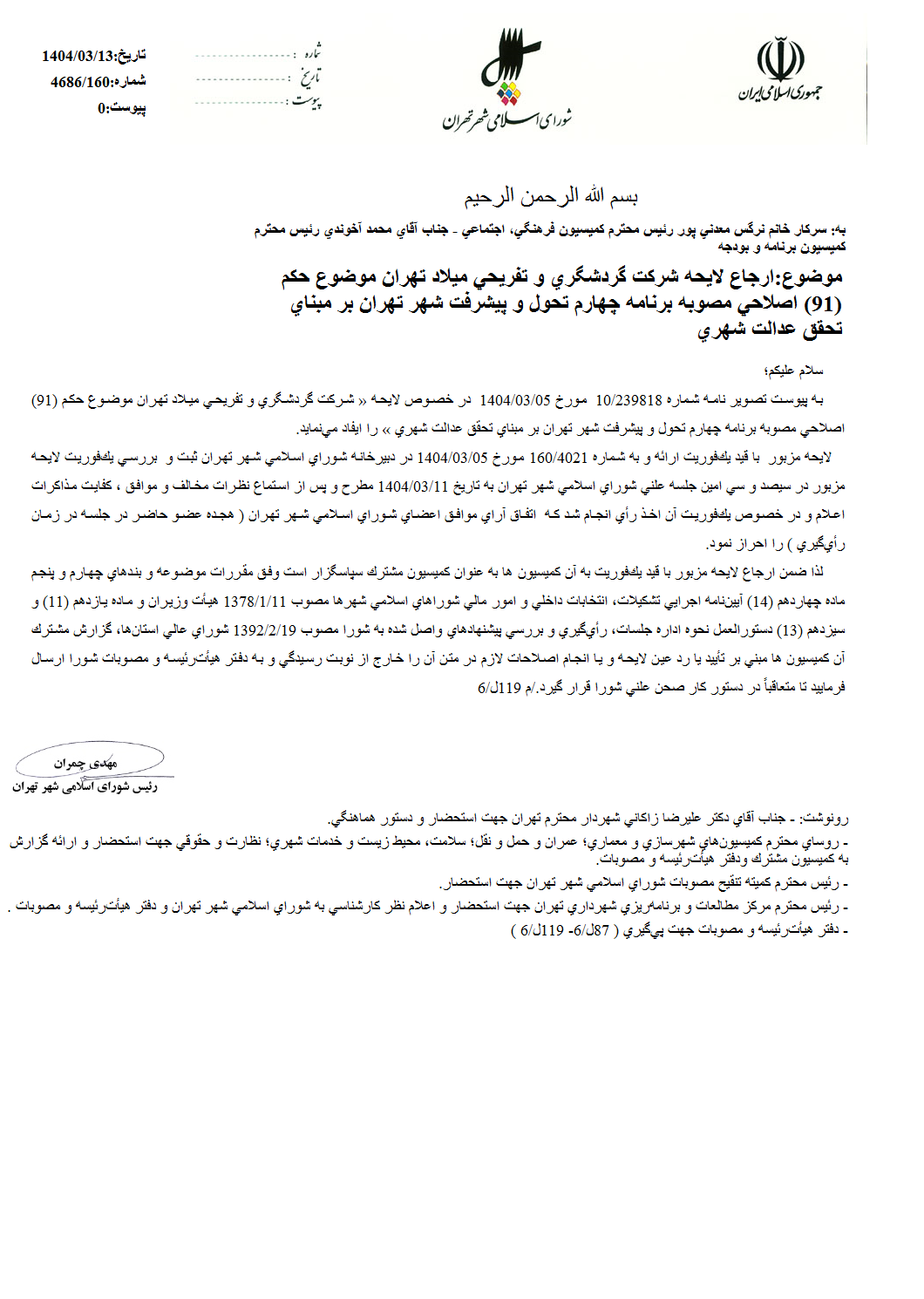 شركت گردشگري و تفريحي ميلاد تهران موضوع حكم (91) اصلاحي مصوبه «برنامه چهارم تحول و پيشرفت شهر تهران بر مبناي تحقق عدالت شهري»