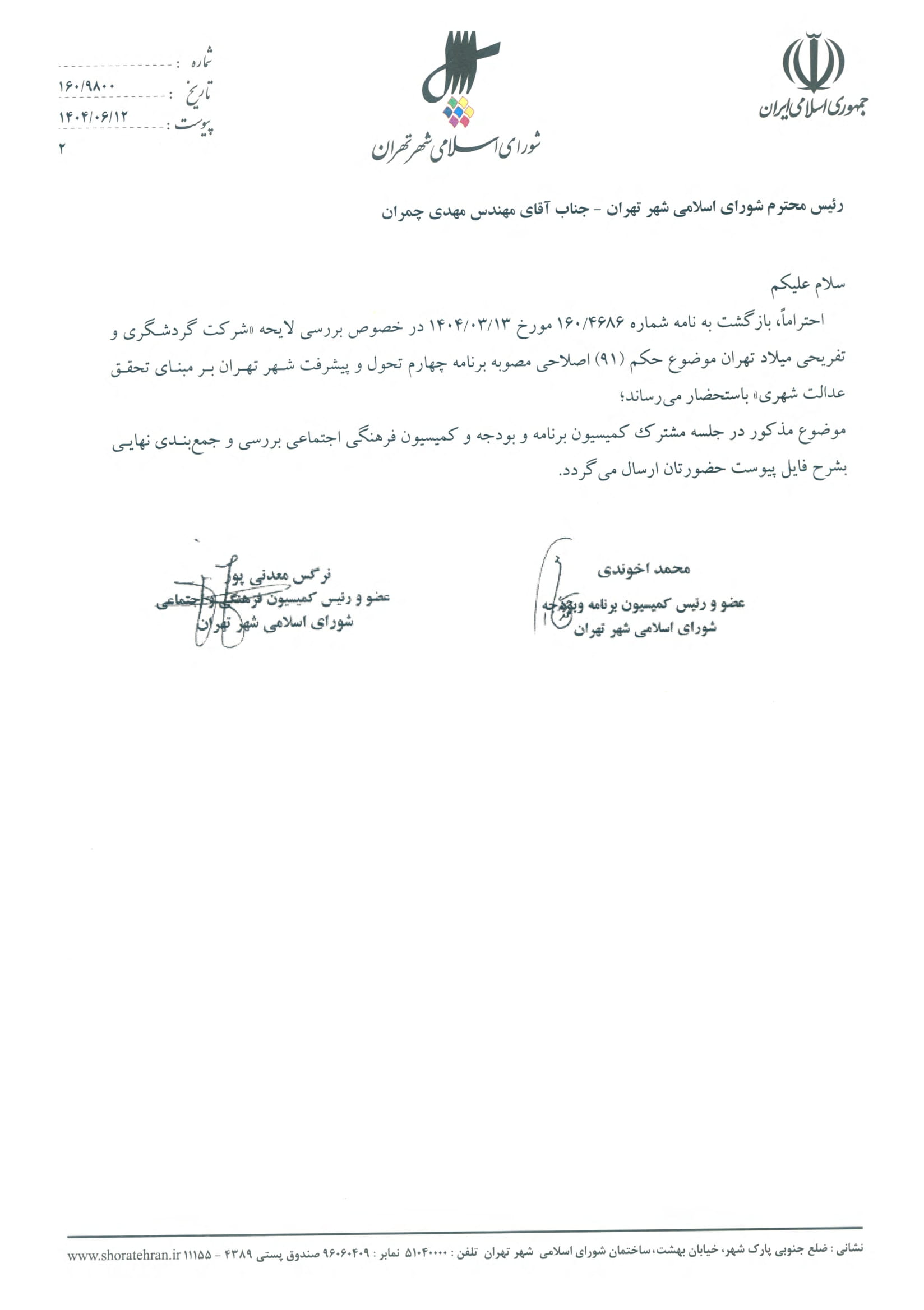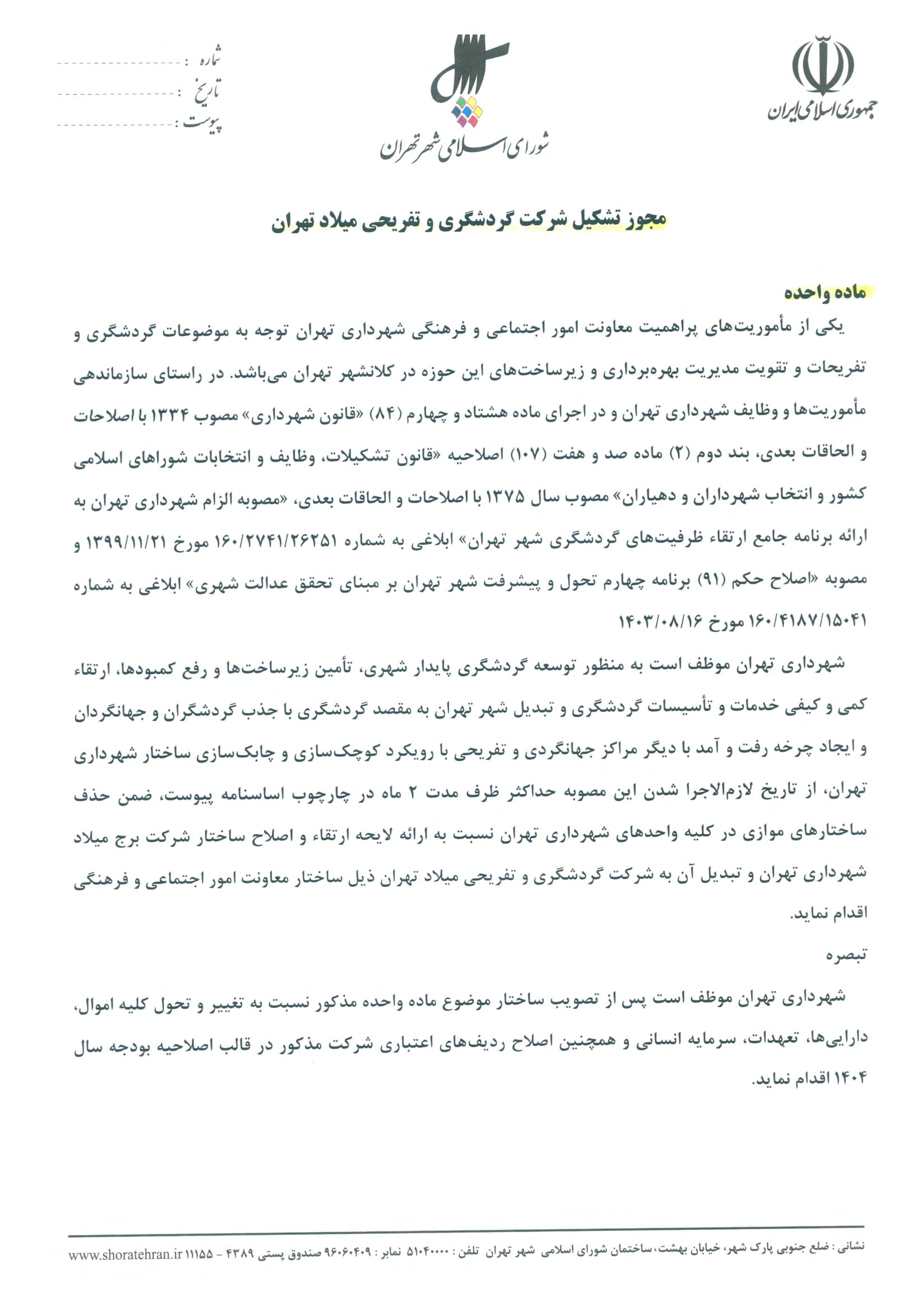 شركت گردشگري و تفريحي ميلاد تهران موضوع حكم (91) اصلاحي مصوبه «برنامه چهارم تحول و پيشرفت شهر تهران بر مبناي تحقق عدالت شهري»