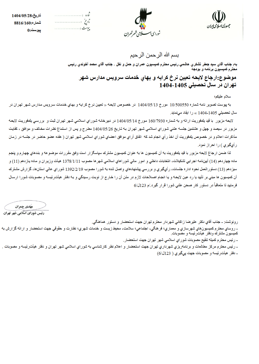 تعيين نرخ كرايه و بهاي خدمات سرويس مدارس شهر تهران در سال تحصيلي 1405-1404