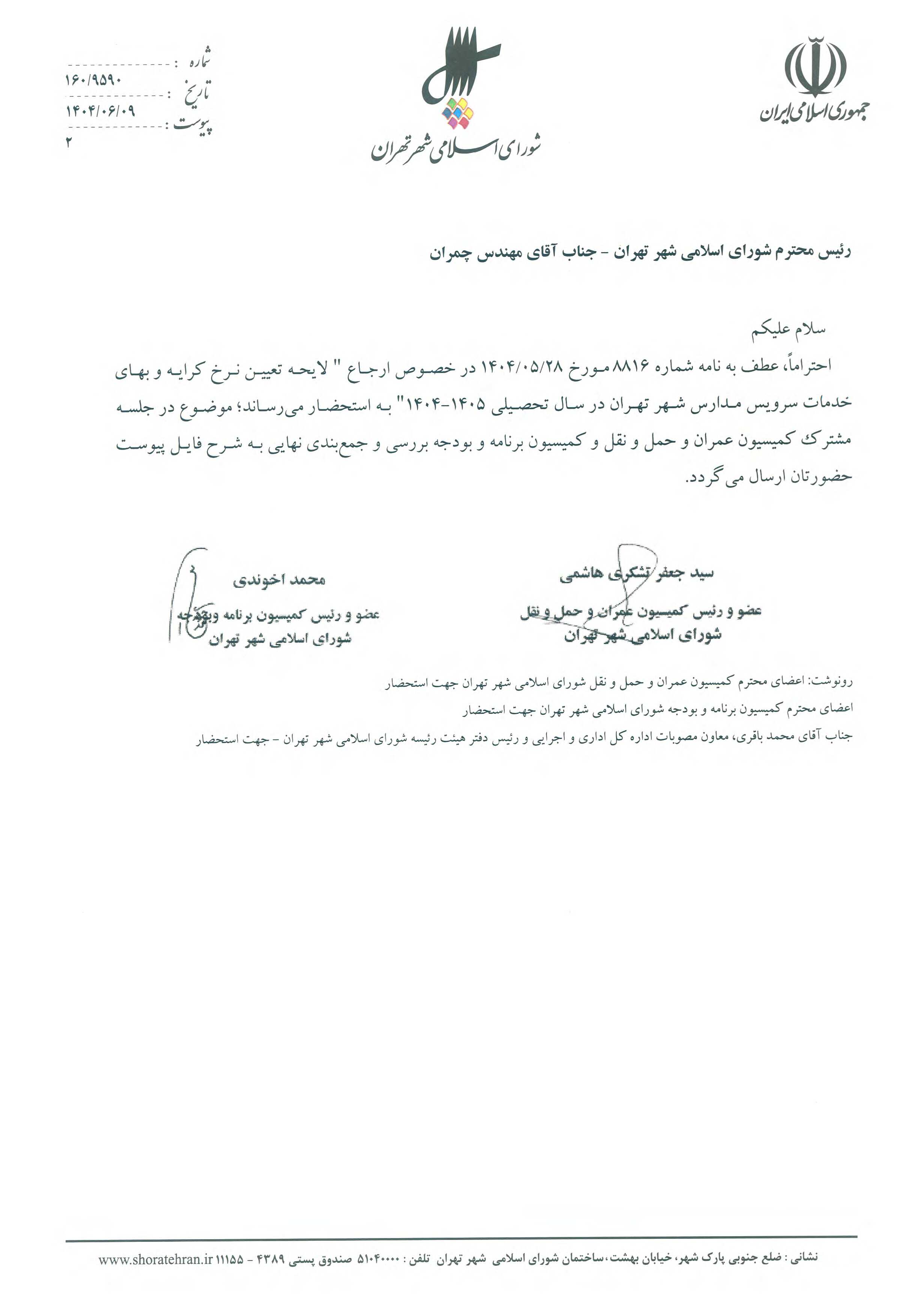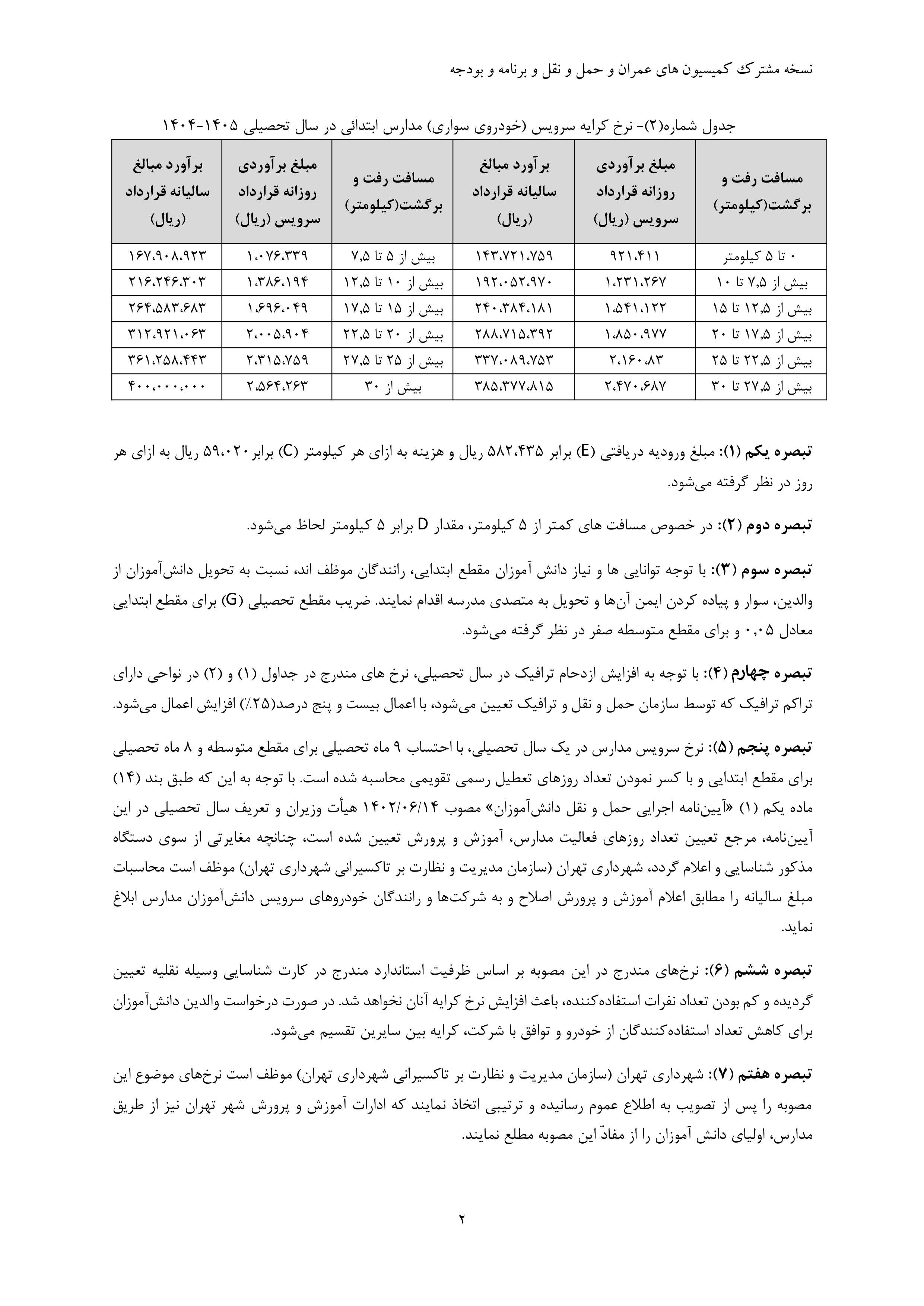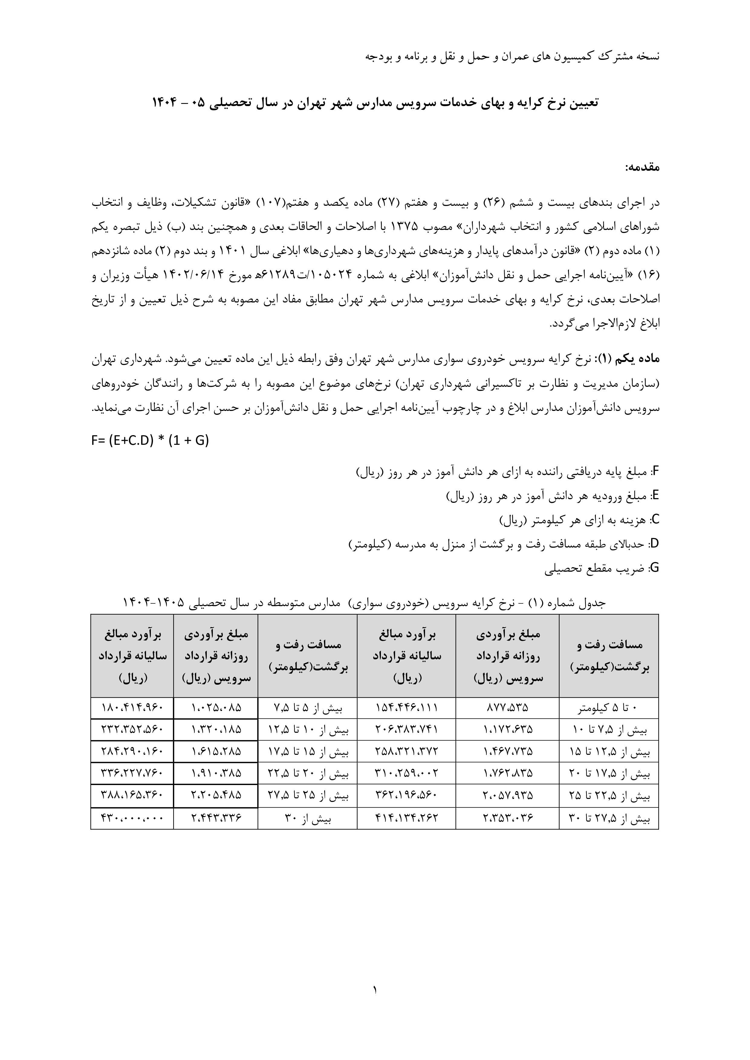 تعيين نرخ كرايه و بهاي خدمات سرويس مدارس شهر تهران در سال تحصيلي 1405-1404