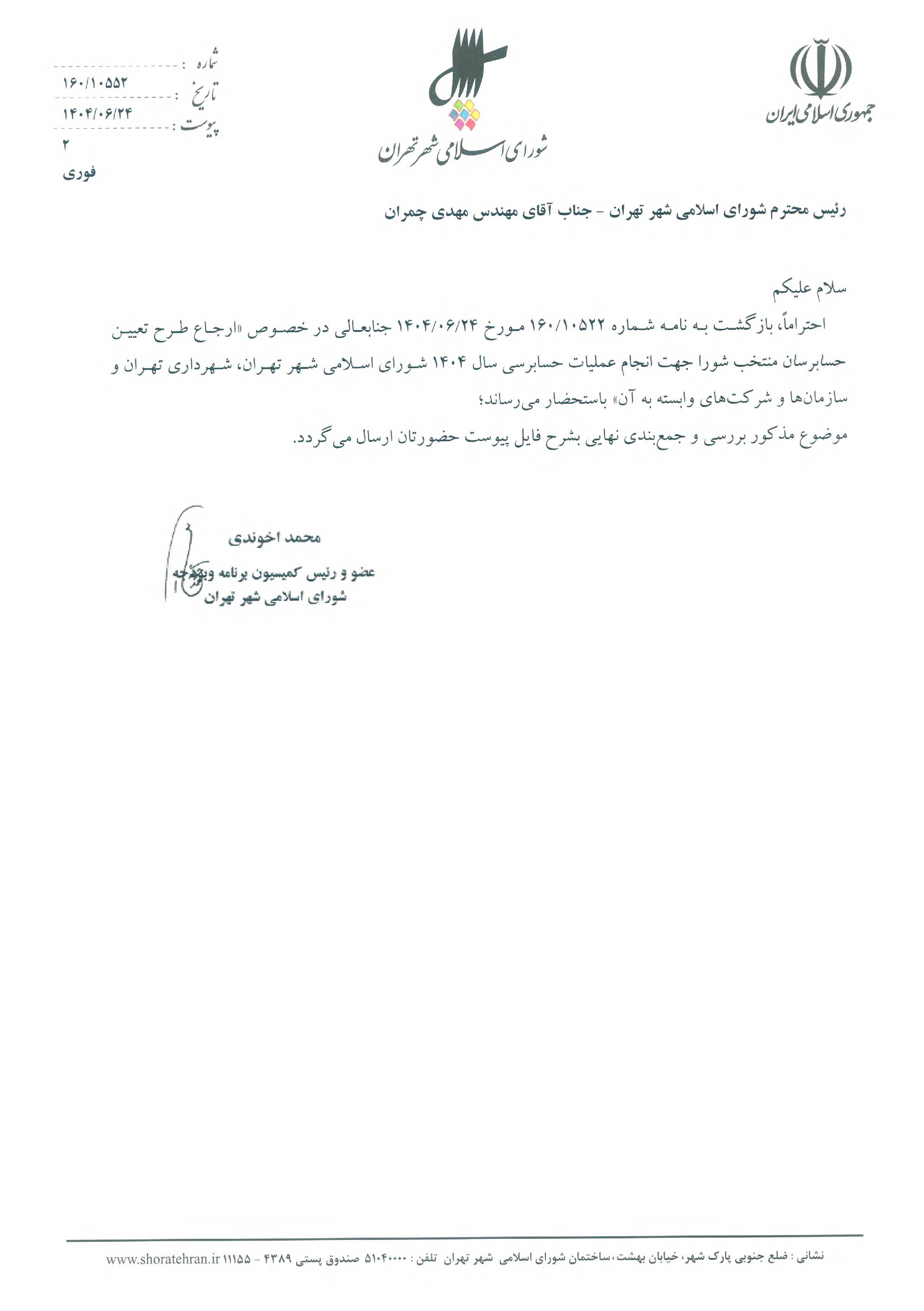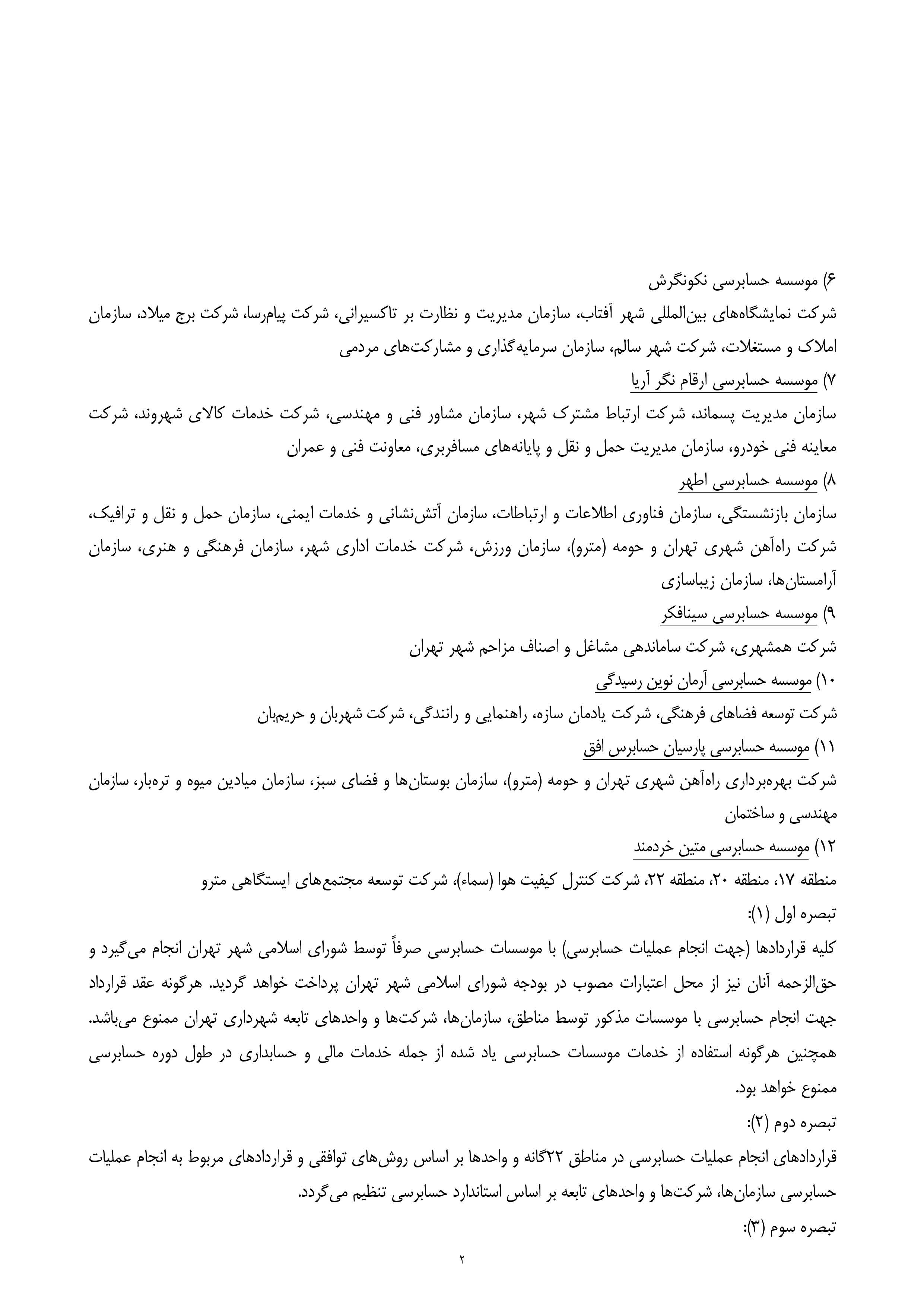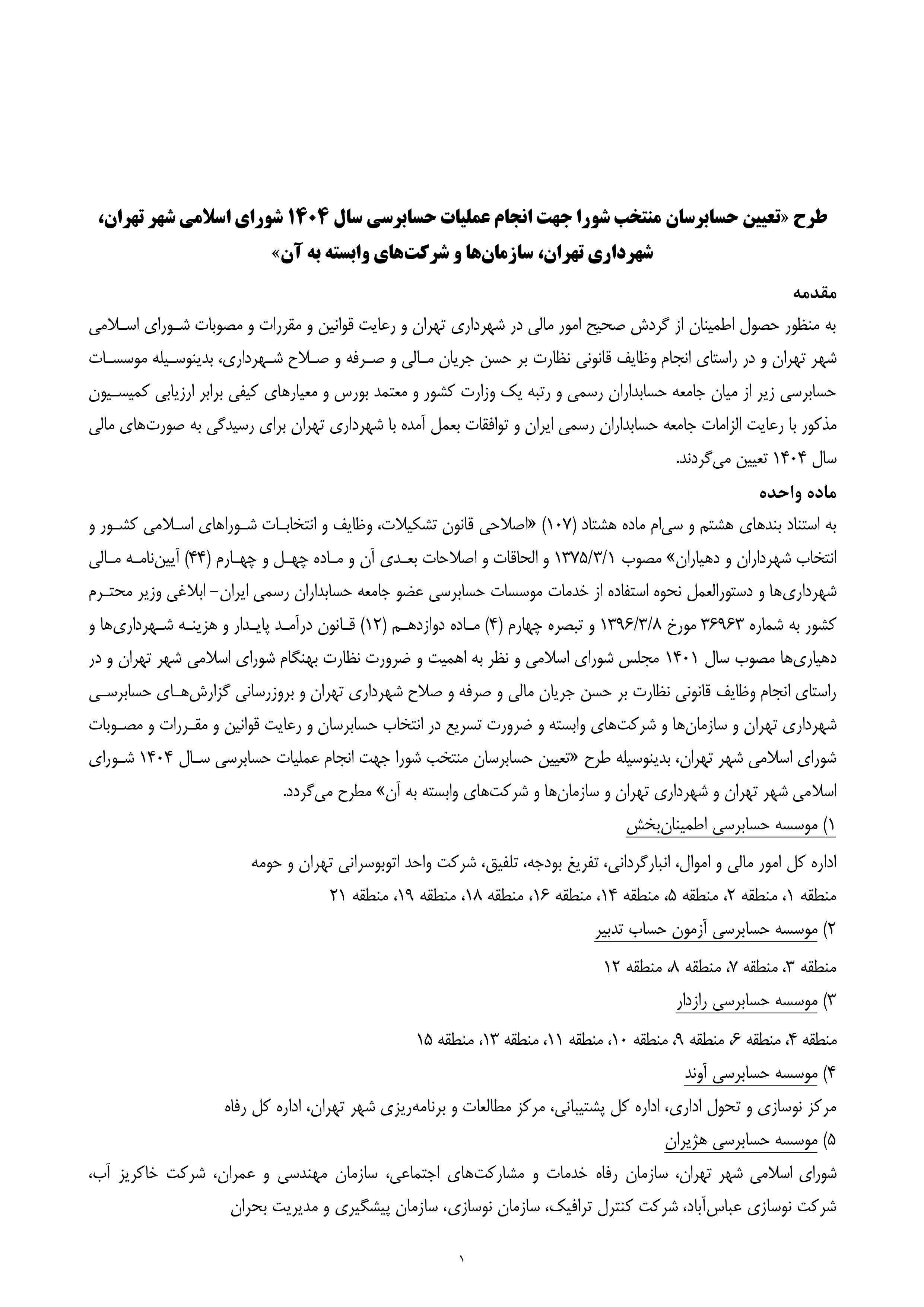 تعيين حسابرسان منتخب شورا جهت انجام عمليات حسابرسي سال 1404 شوراي اسلامي شهر تهران، شهرداري تهران و سازمانها و شركتهاي وابسته به آن